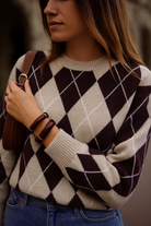 Deze heerlijke trui valt wat wijder en heeft een mooi ruitenpatroon. Shop hem in taupe/choco!