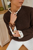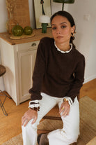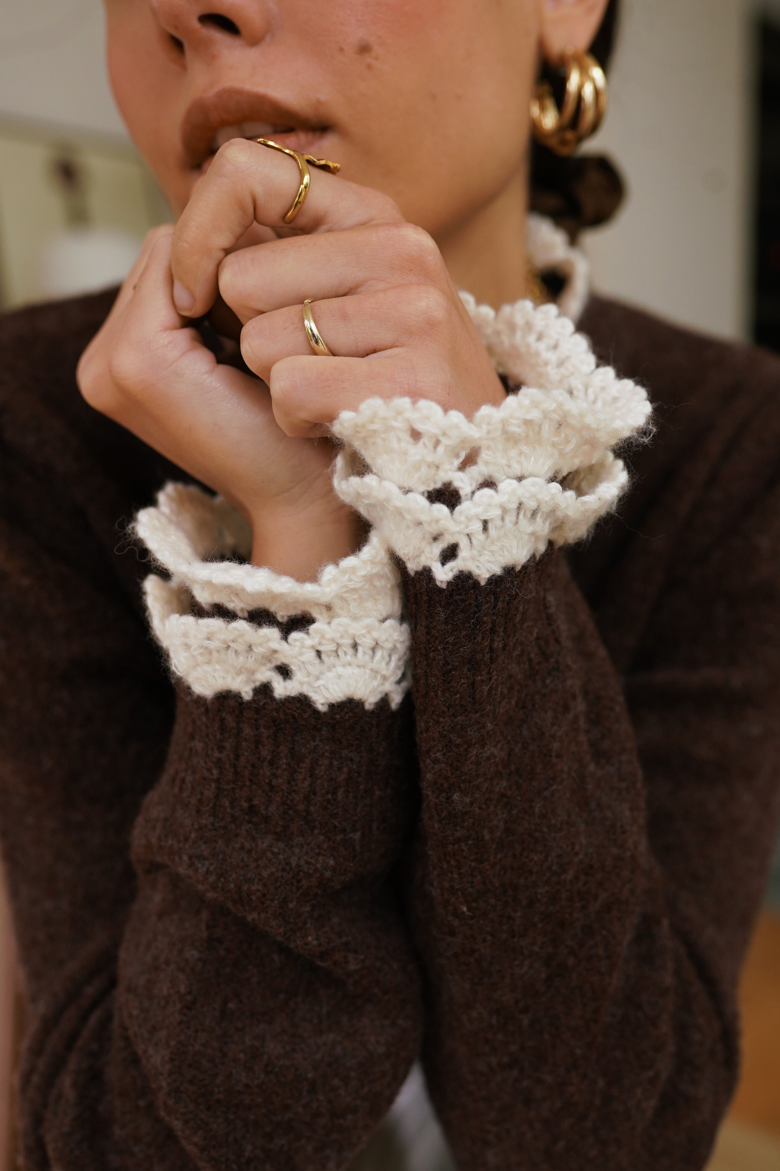 Deze fijne sweater heeft leuke crochet details in de kraag en de mouwen. Shop hem in brown!