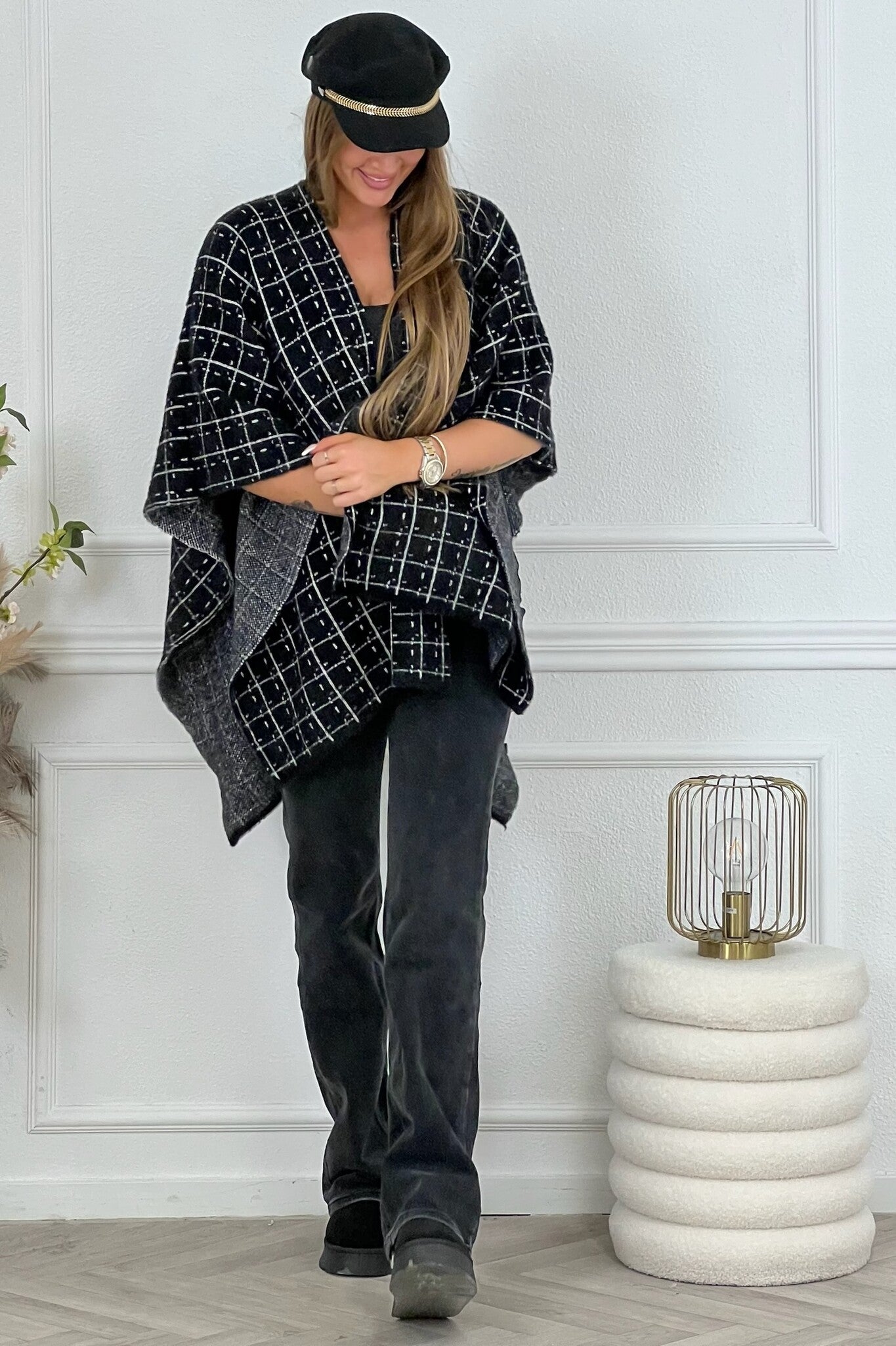 Deze poncho sla je heerlijk om je heen en zorgt ervoor dat jij nog heerlijk op een terras kan zitten in het najaar! Shop hem in black/grey, met glitters!