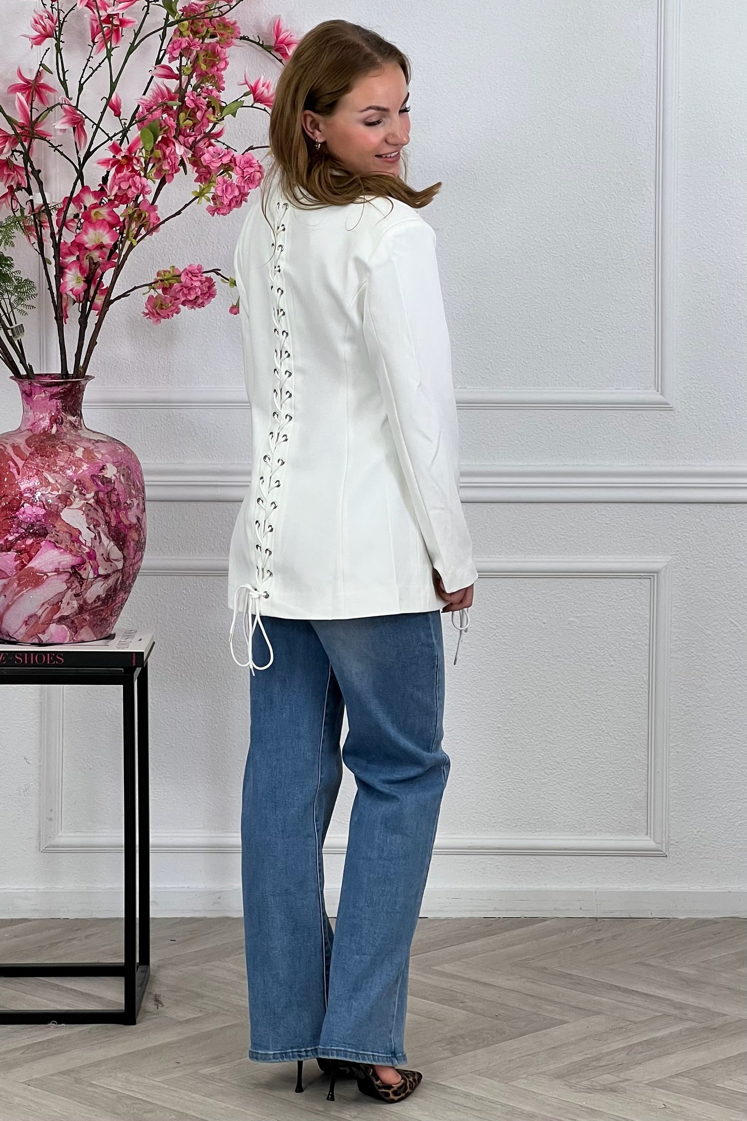 We hebben weer een nieuwe blazer binnen! Deze met een leuk geveterd detail over de blazer. Shop hem in white!