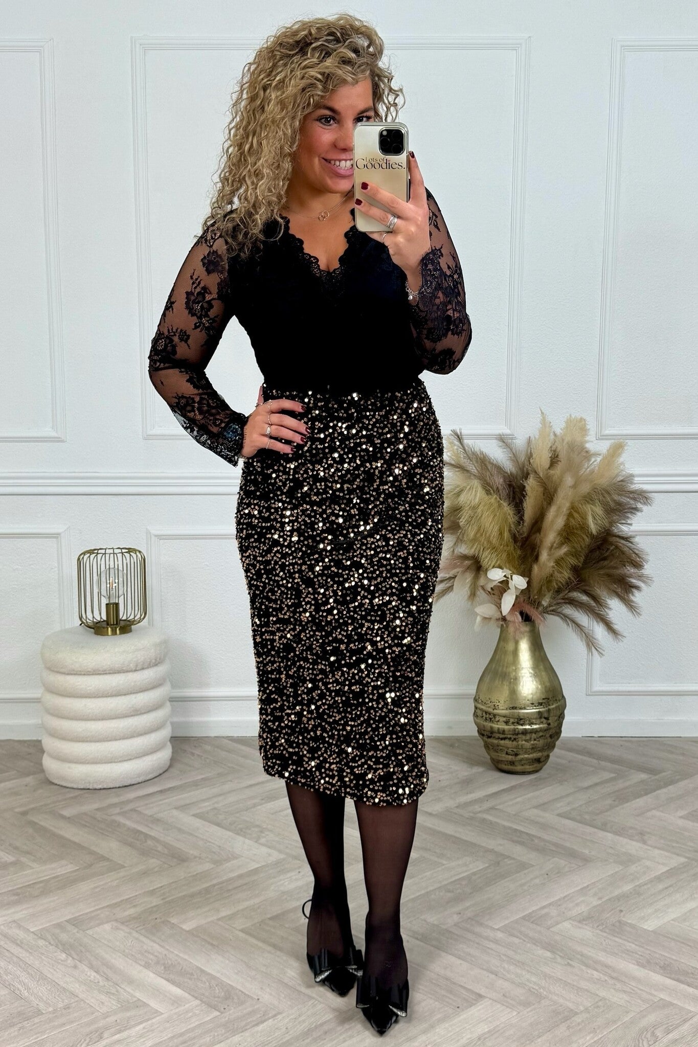 We love this skirt! Deze rok heeft mooie lovertjes. Shop hem in black/gold!