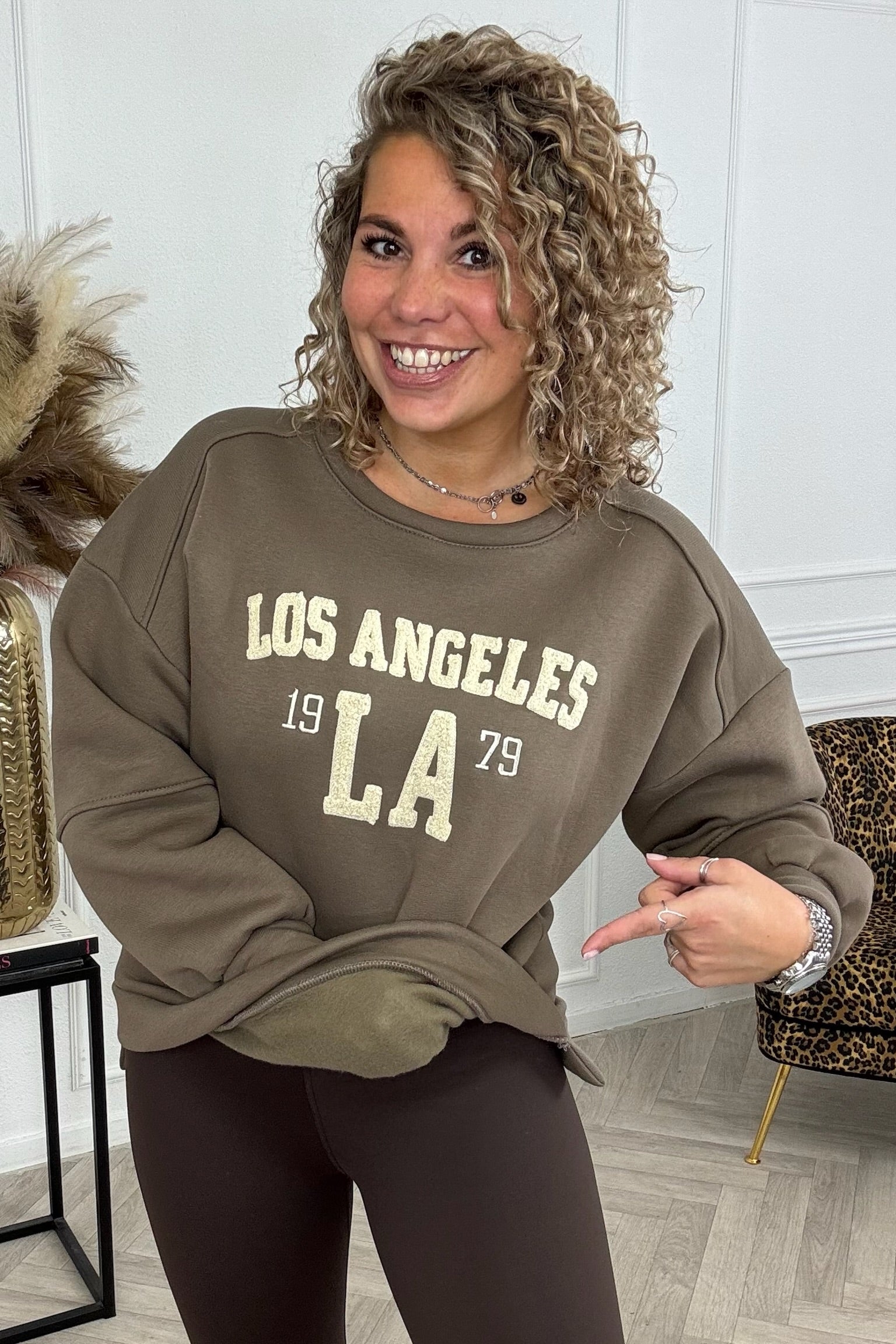 Een heerlijk zachte sweater met een leuke opvallend gekleurde tekst! Shop de soft LA sweater nu in taupe!
