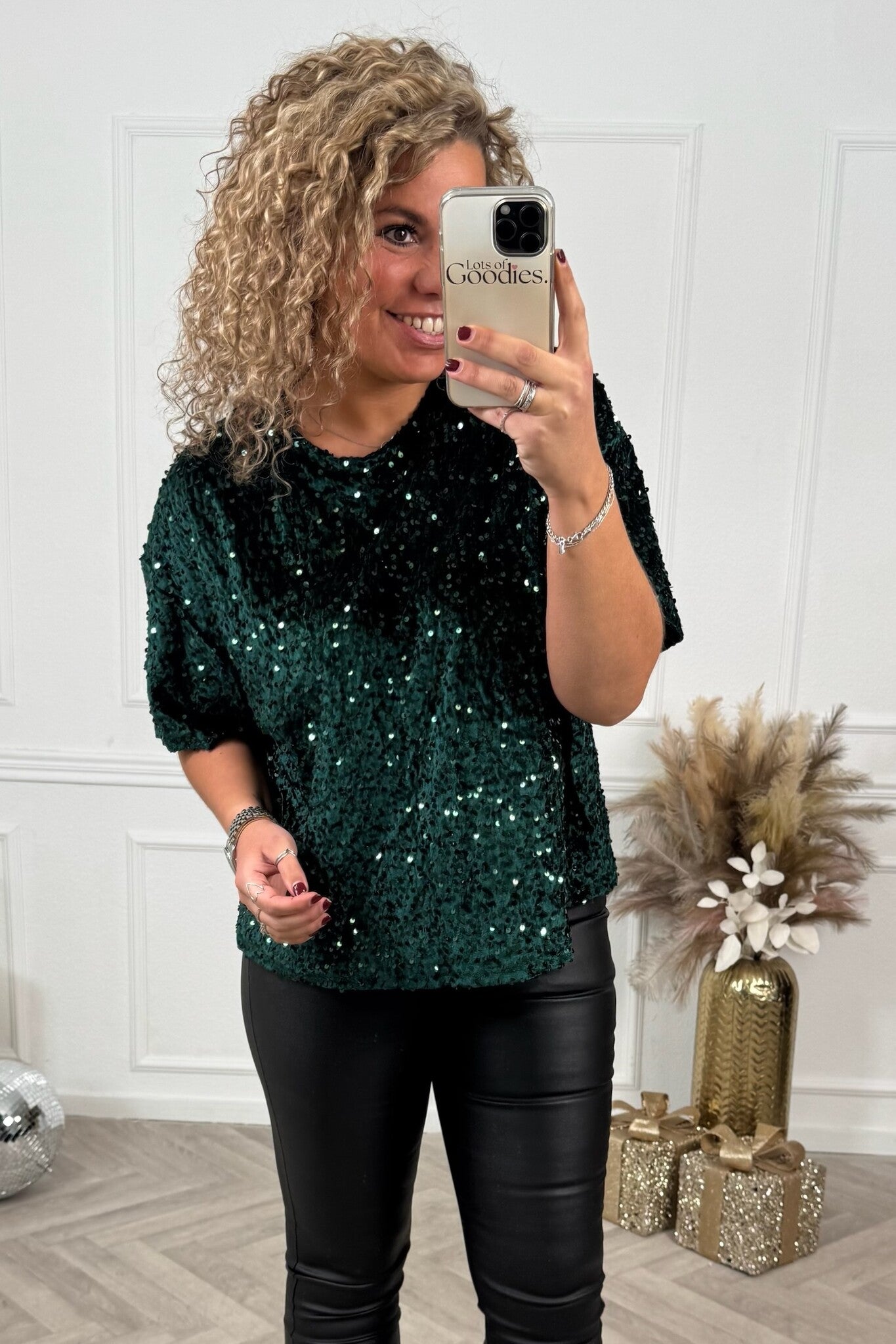 We hebben een superleuk nieuw glitter t-shirtje binnen, verkrijgbaar in 4 kleuren! Shop hem nu in dark green.