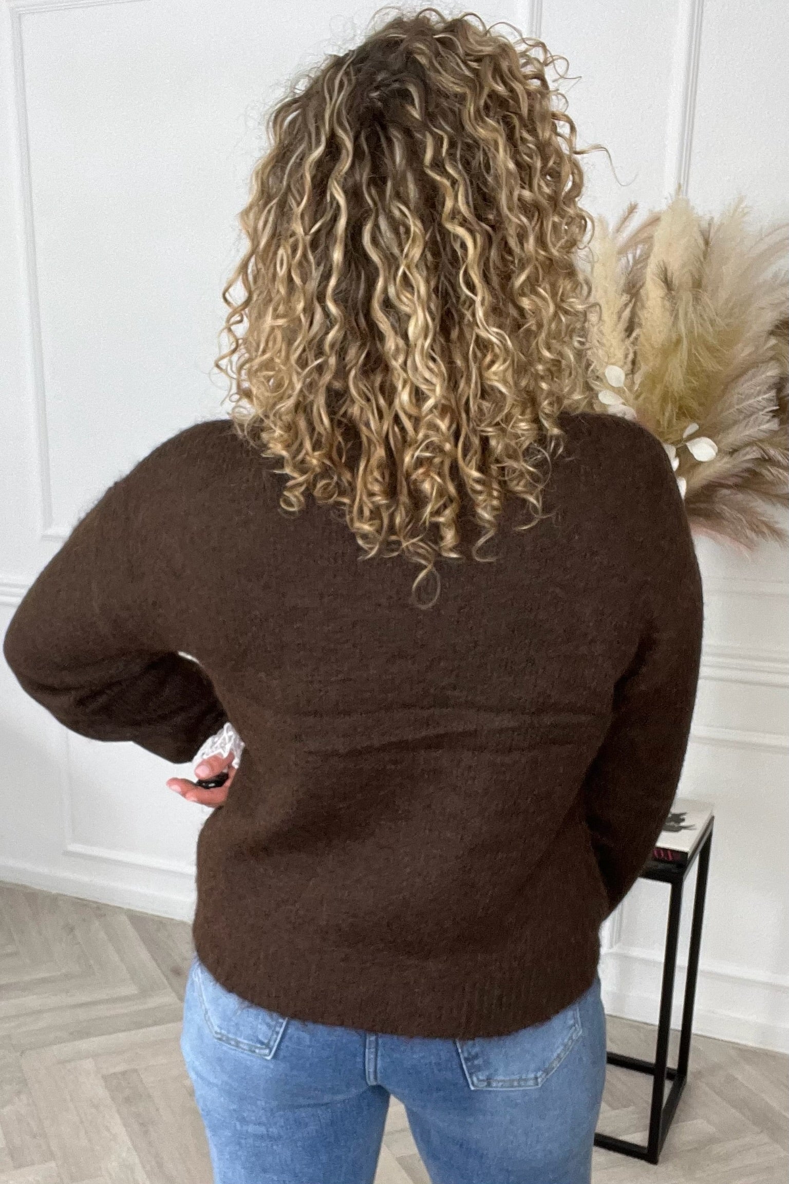 Een prachtige trui! Bruin, helemaal de trendy kleur van nu. En dan ook nog eens afgewerkt met kanten mouwtjes aan de onderkant! Shop de jadie detailed lace sleeve sweater nu in brown.