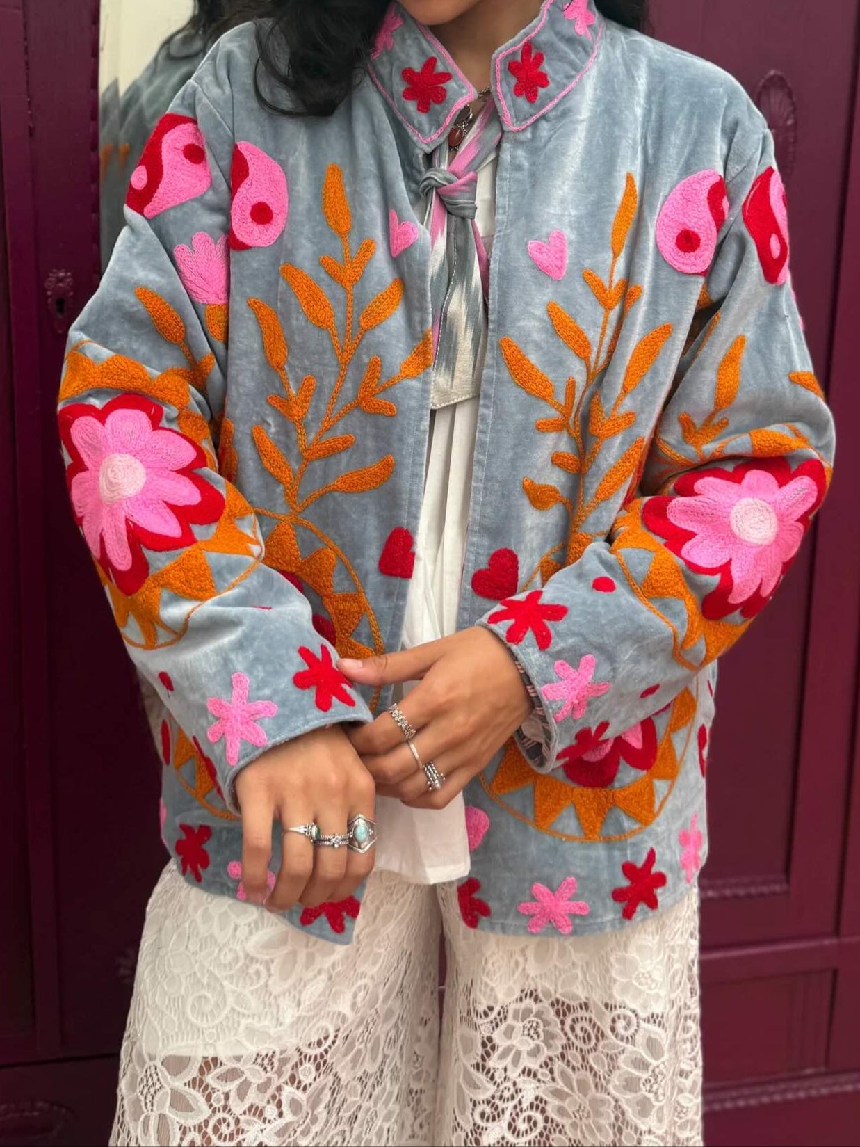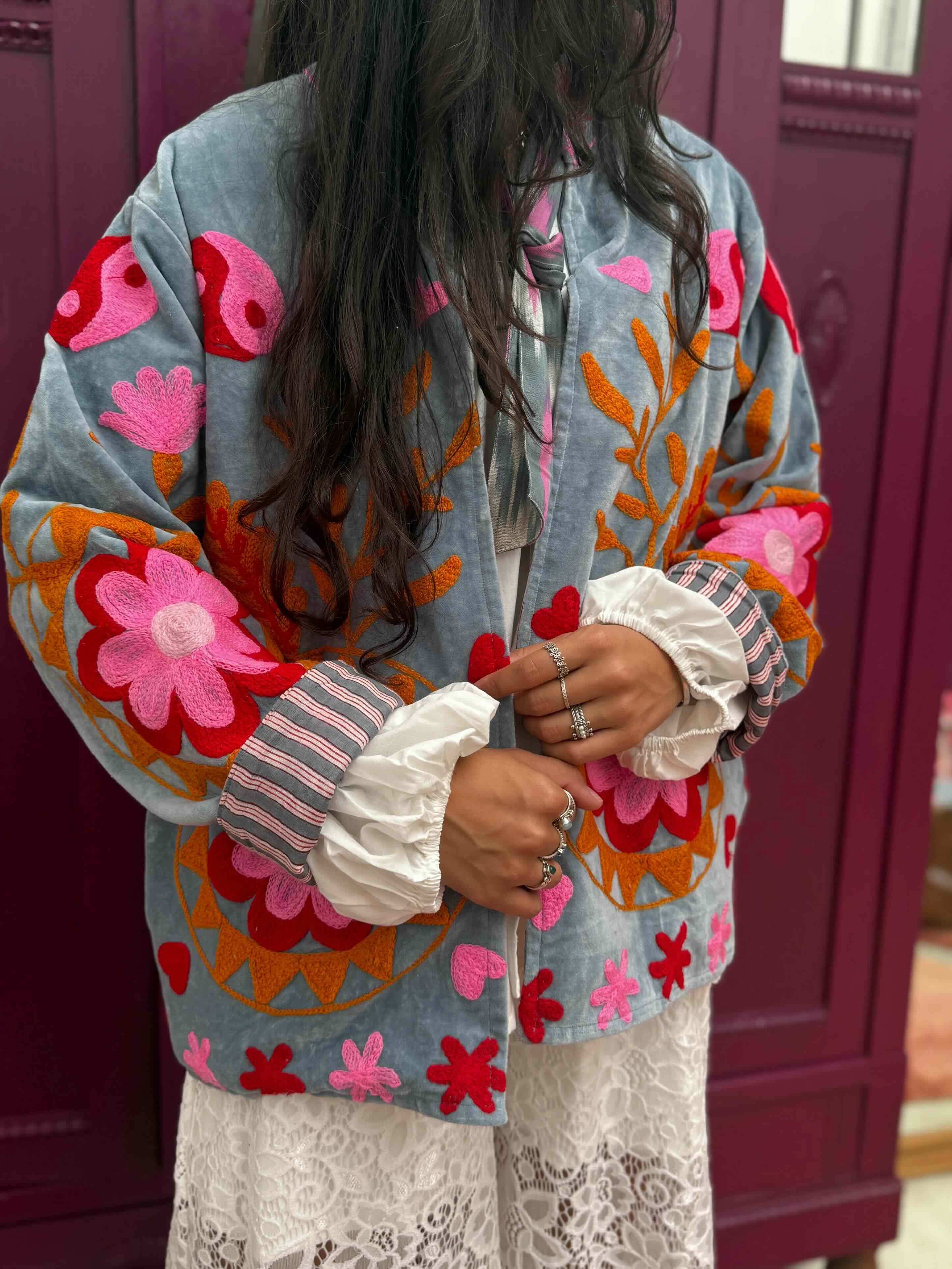 Velvet Embroidery Daisy Jacket - Pink/Grey