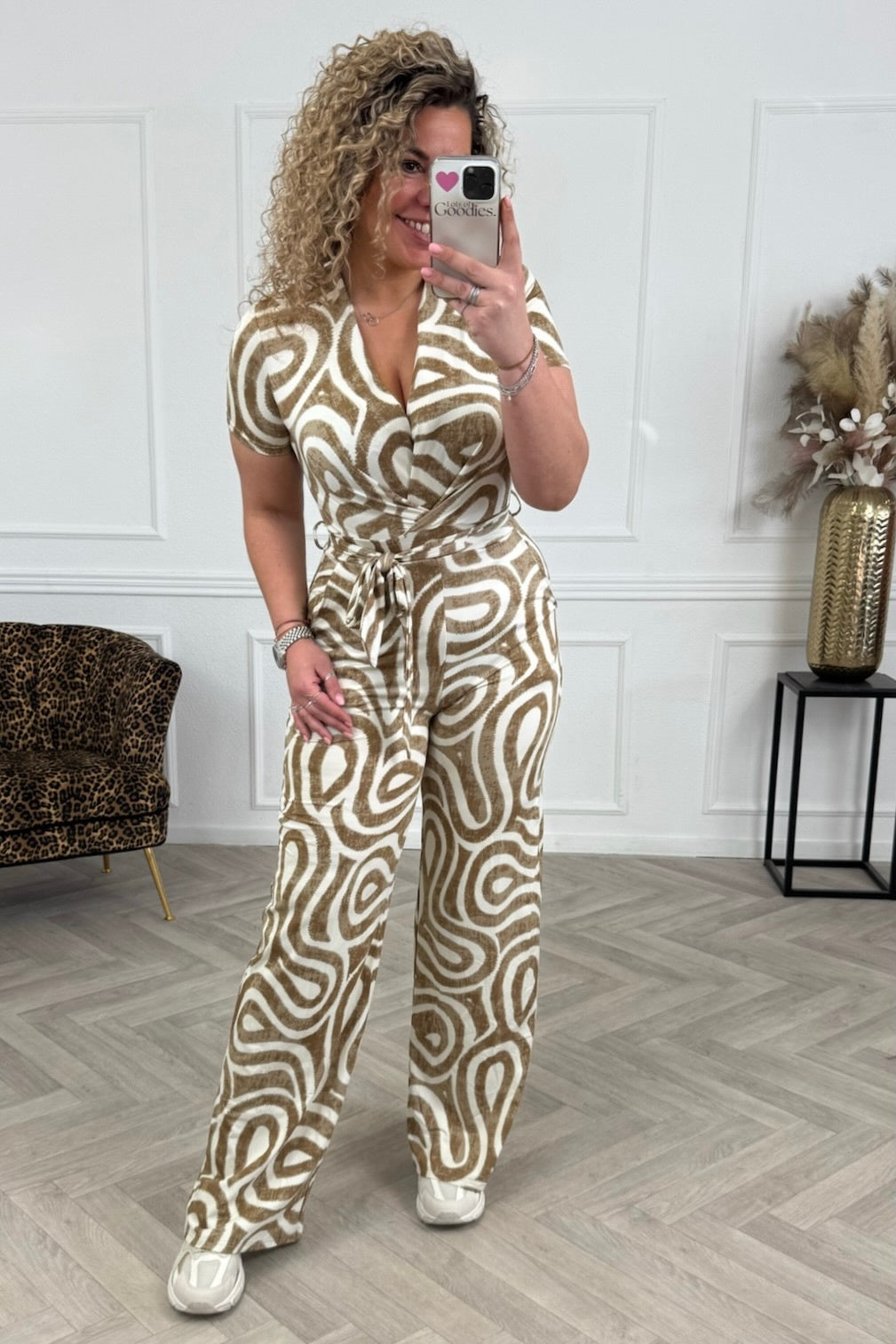 Long Sleeve Swirl Jumpsuit - Beige/Black