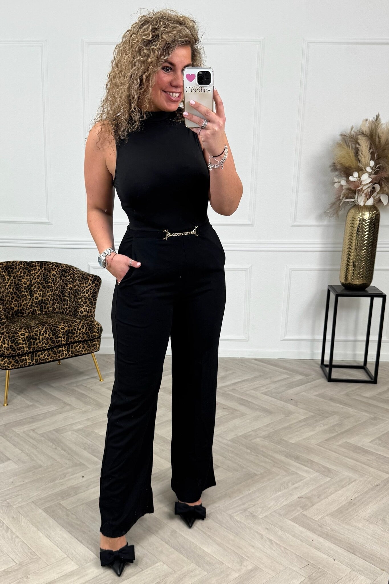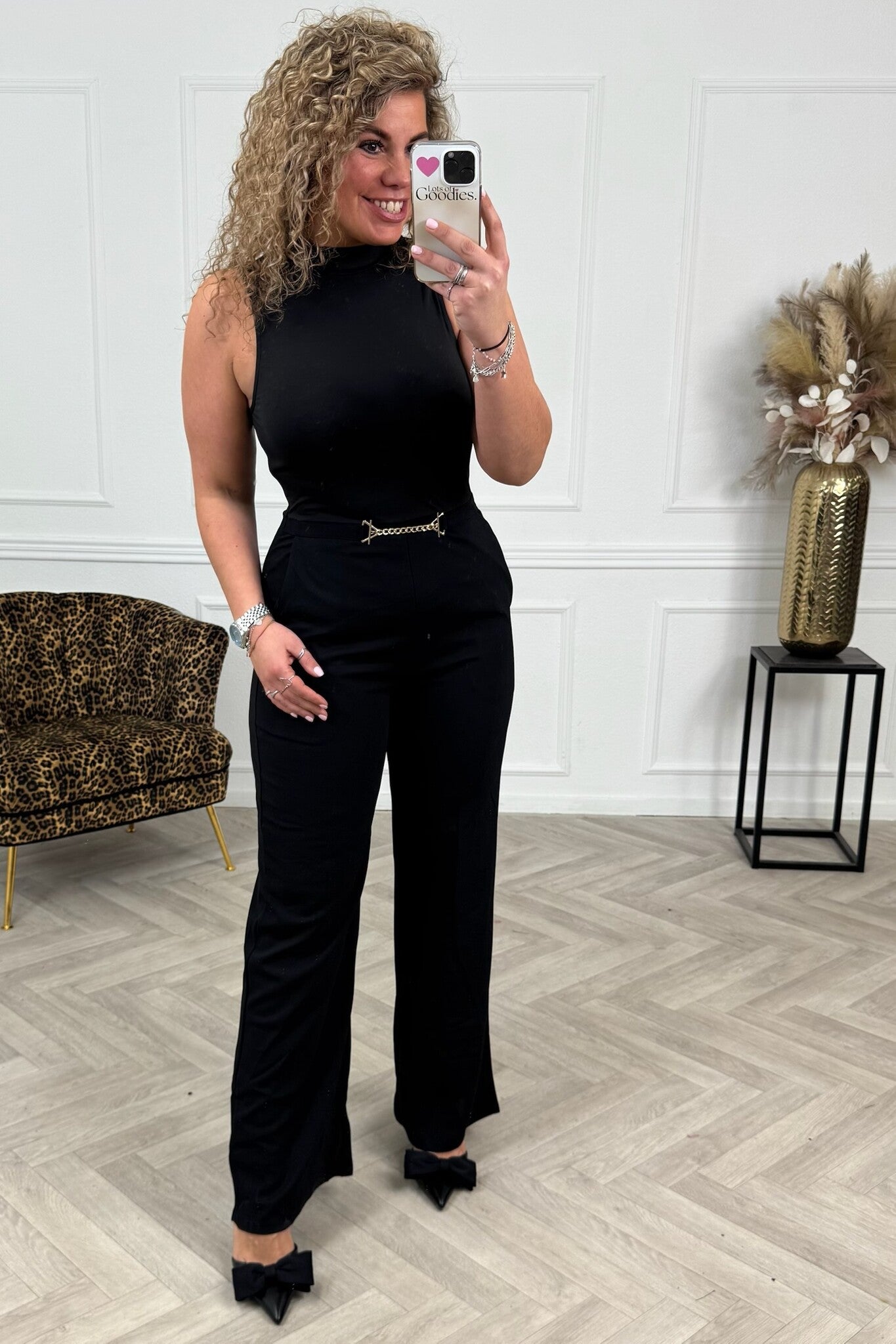 Een mooie jumpsuit zonder mouwen met een goud detail! Verkrijgbaar in verschillende kleuren en printjes! Shop hem in zwart!
