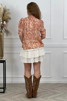Shop deze mooie blouse met een prachtige barok print nu in beige!