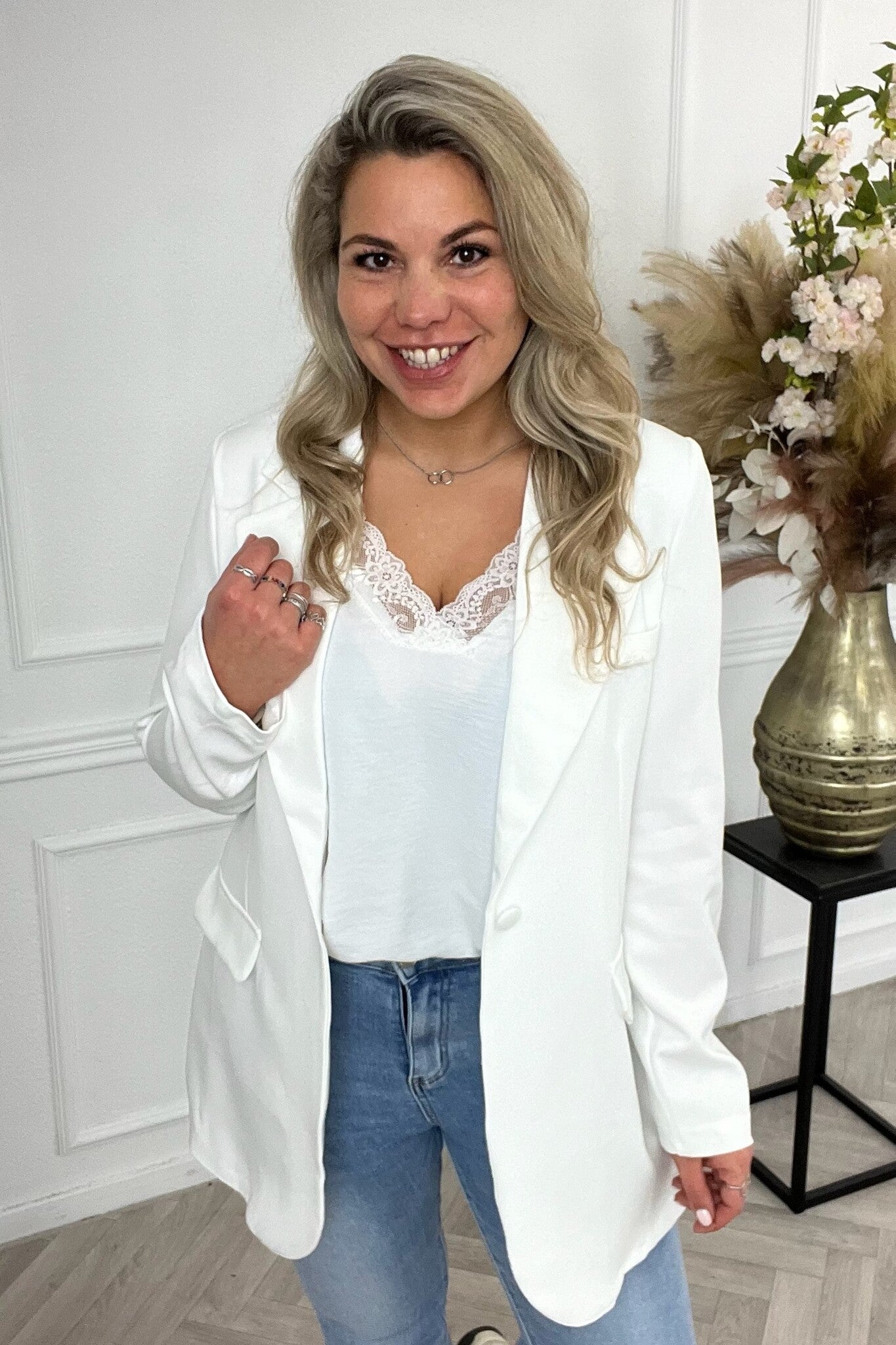 We hebben weer prachtige basic blazers in huis, perfect om al je outfits mee af te stylen! Deze blazer heeft een loose fit en fake zakken. Shop hem in white!