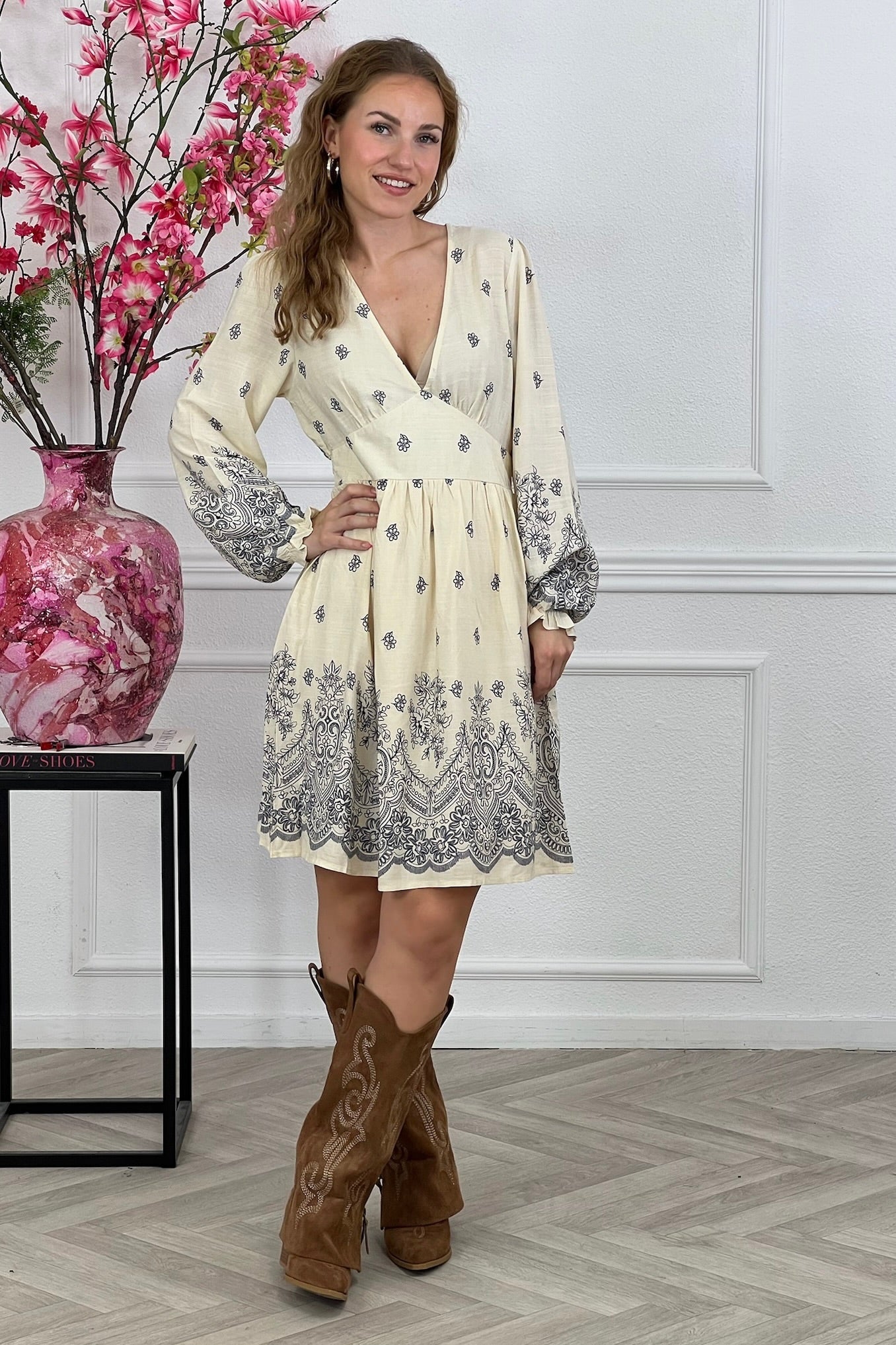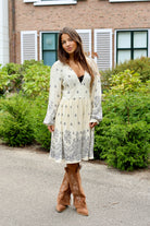 Deze supermooie jurk heeft een v hals, lange mouwen en een prachtige barok print! Shop hem nu in creme.