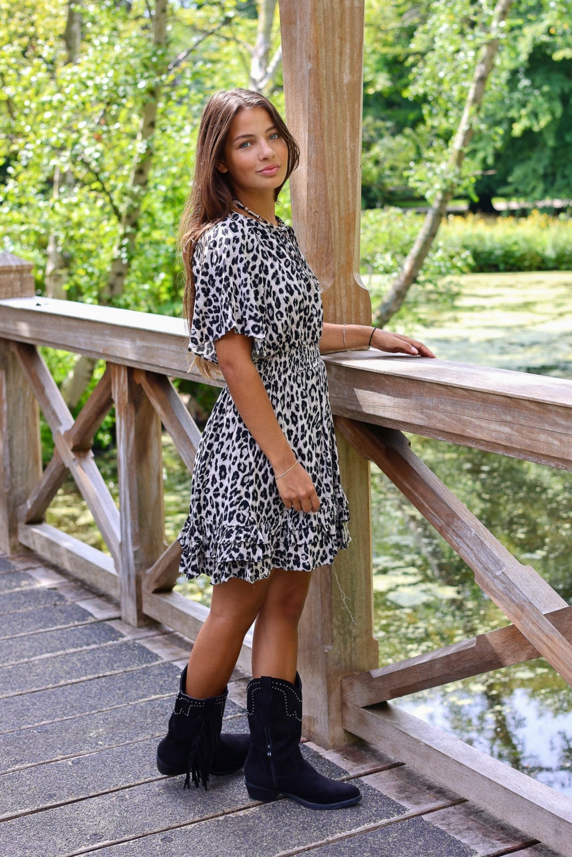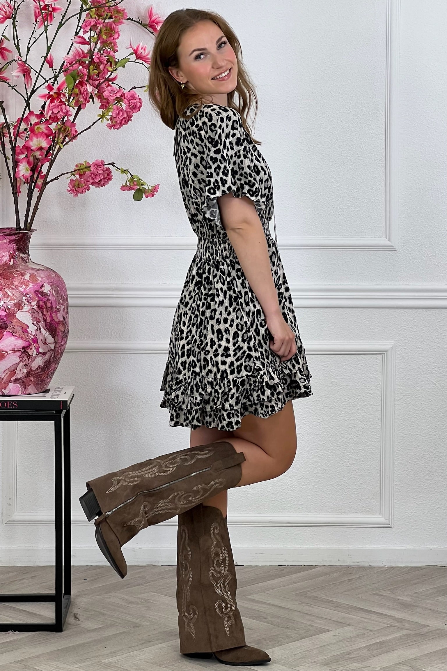 Deze superleuke jurk met een smocked taille, een strikje en leopard print is toch zo leuk! Shop hem nu in light grey.