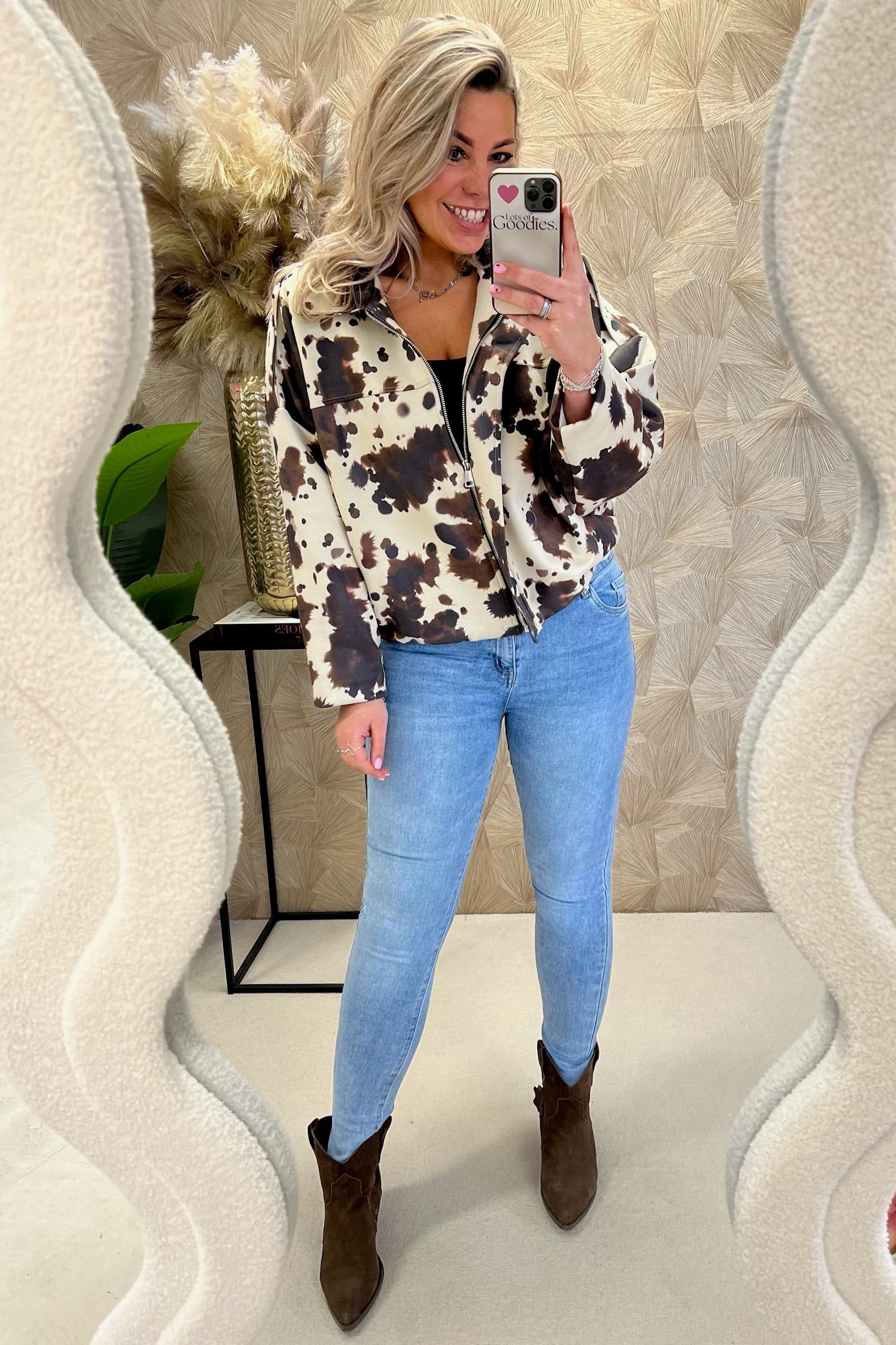 Deze mooie suede bomber is de perfecte eyecatcher voor de herfst! Shop hem nu met mooie cow print in beige/brown!