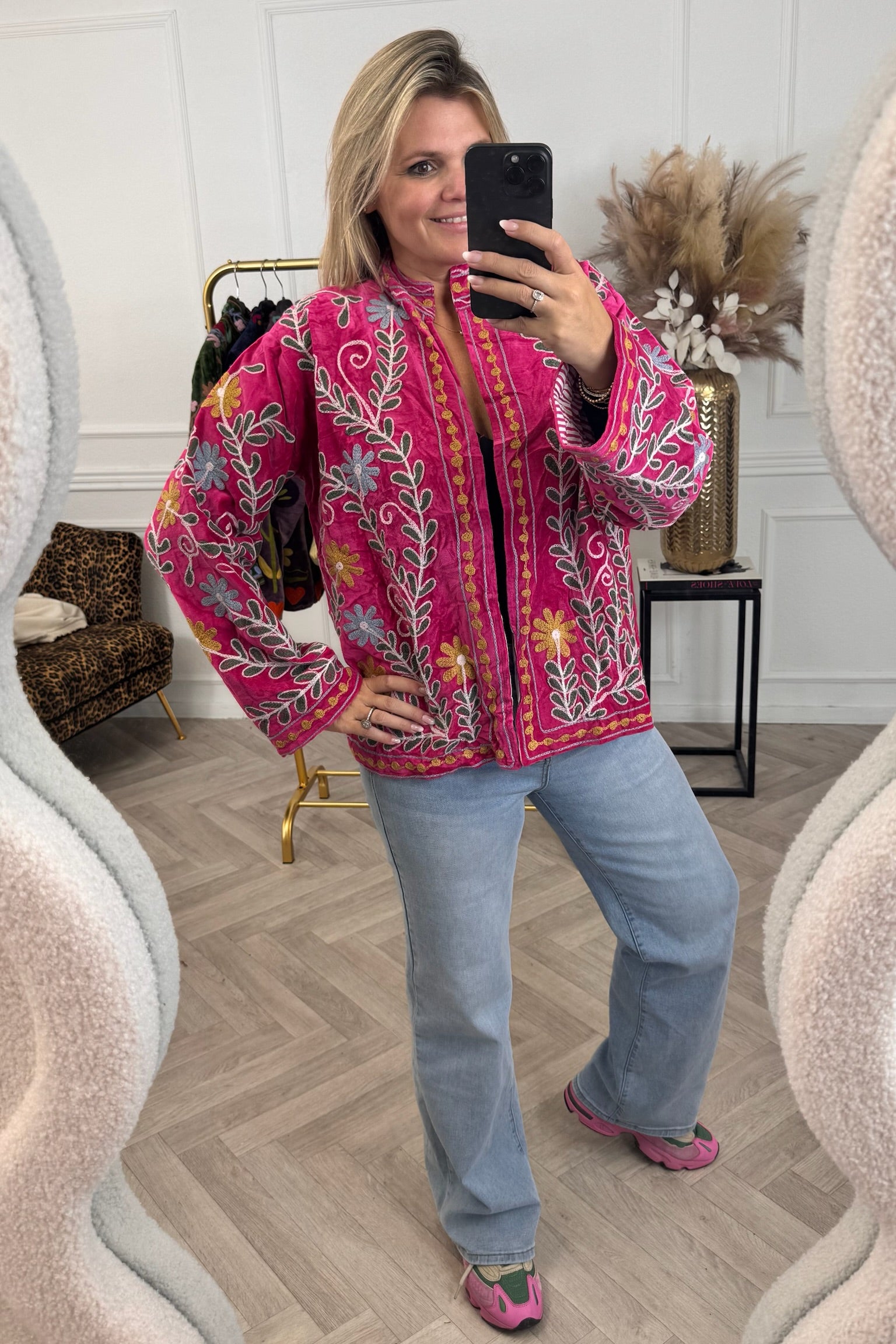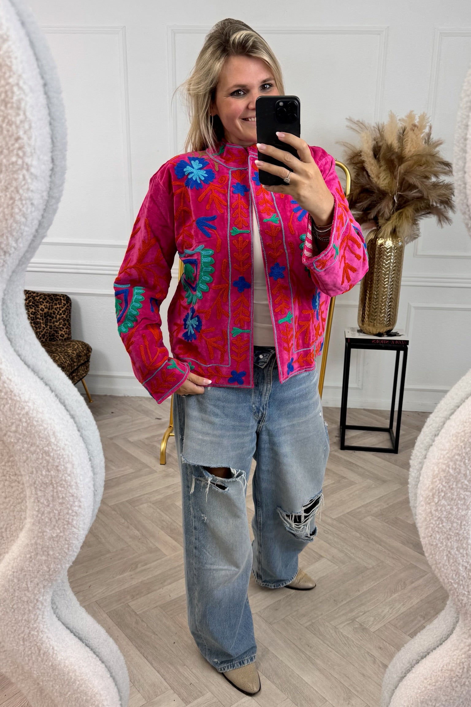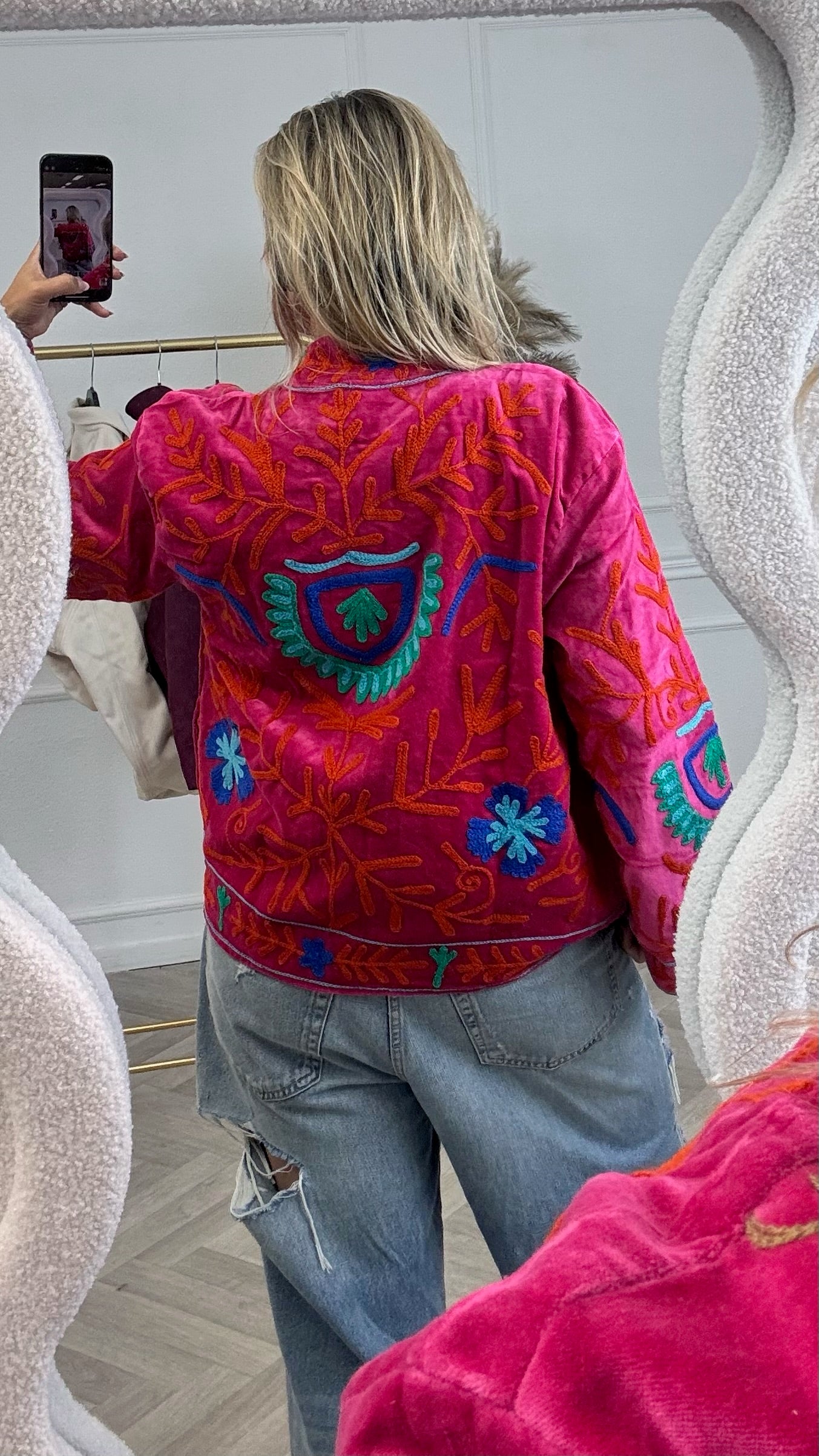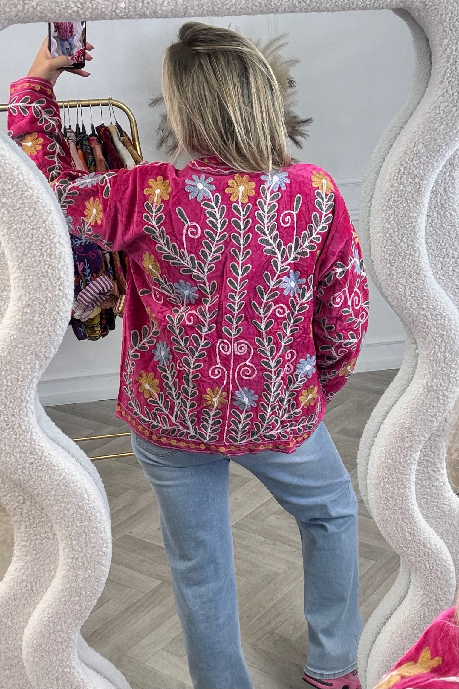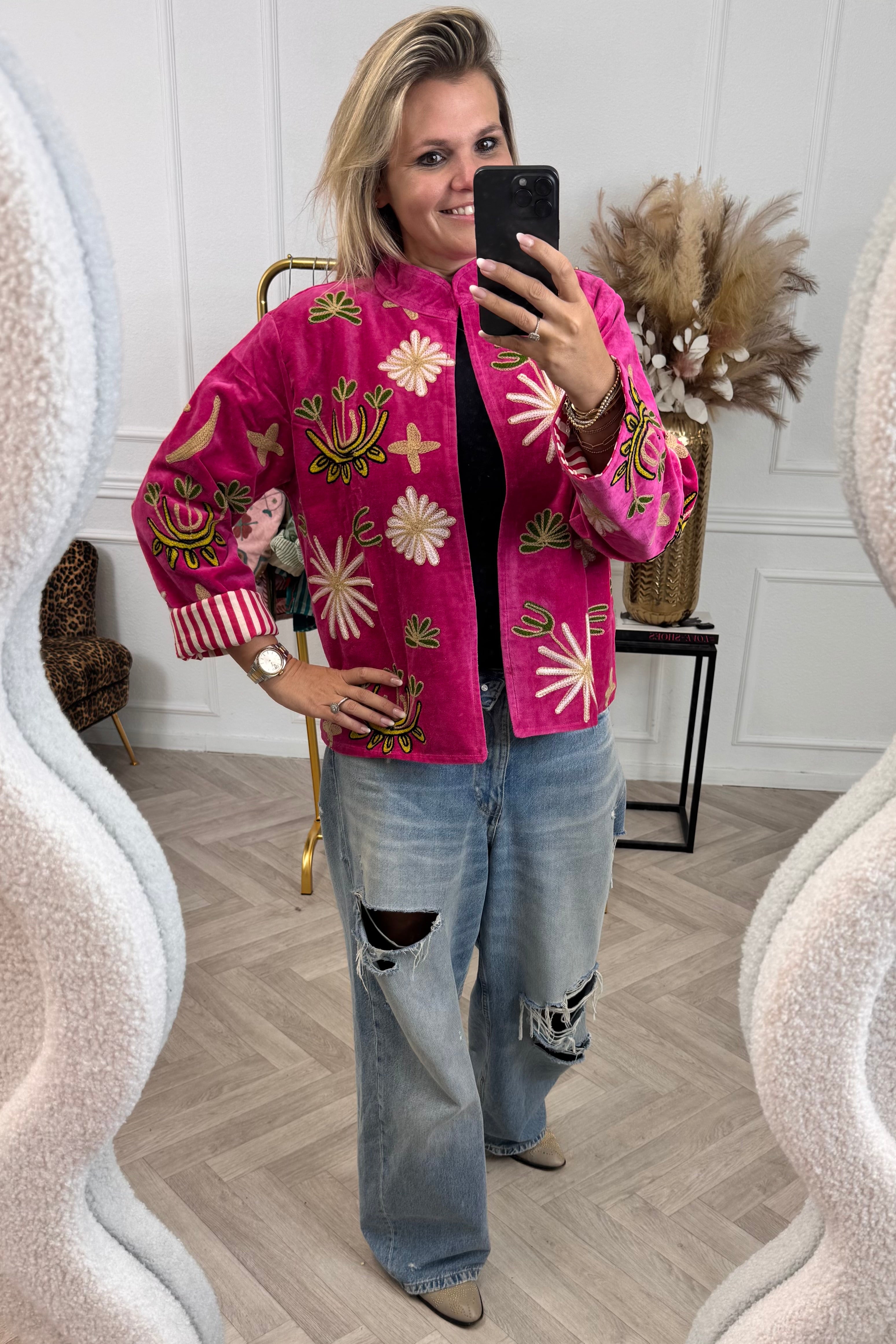 Cotton Velvet Flower Leaves Jacket - Pink/Turquoise