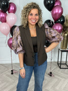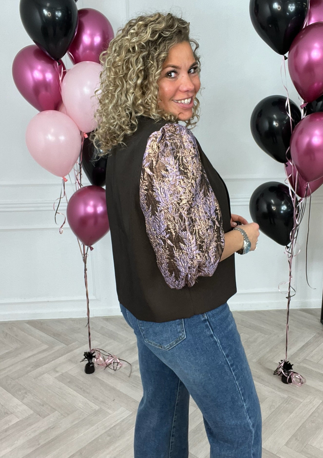 De classy short sleeve blazers hebben gedetailleerde mouwen met een prachtige bloemen patroon. De blazer heeft imitatie zakken aan de voorkant en een mooie fit. Shop hem in bronze/lila!
