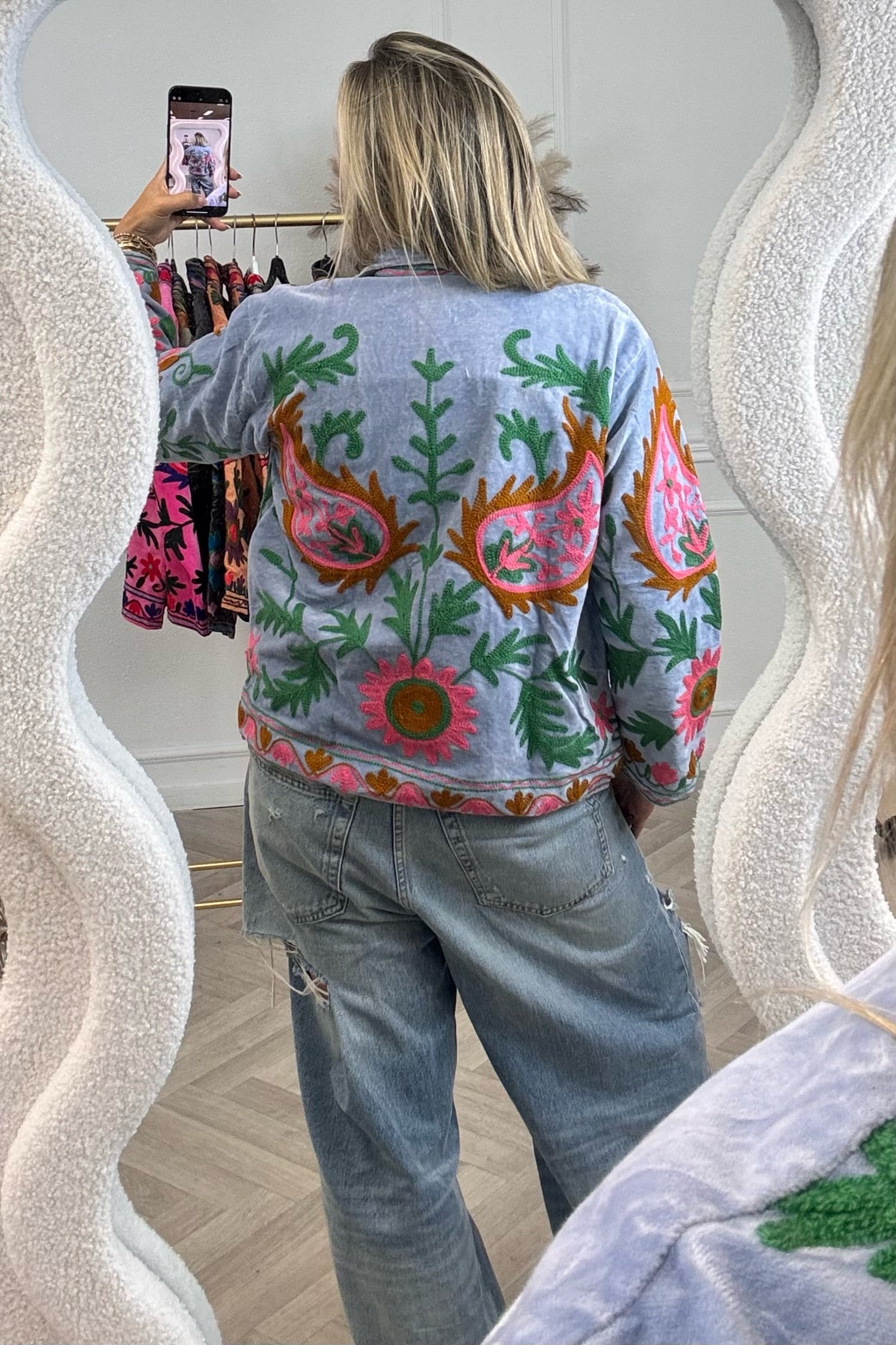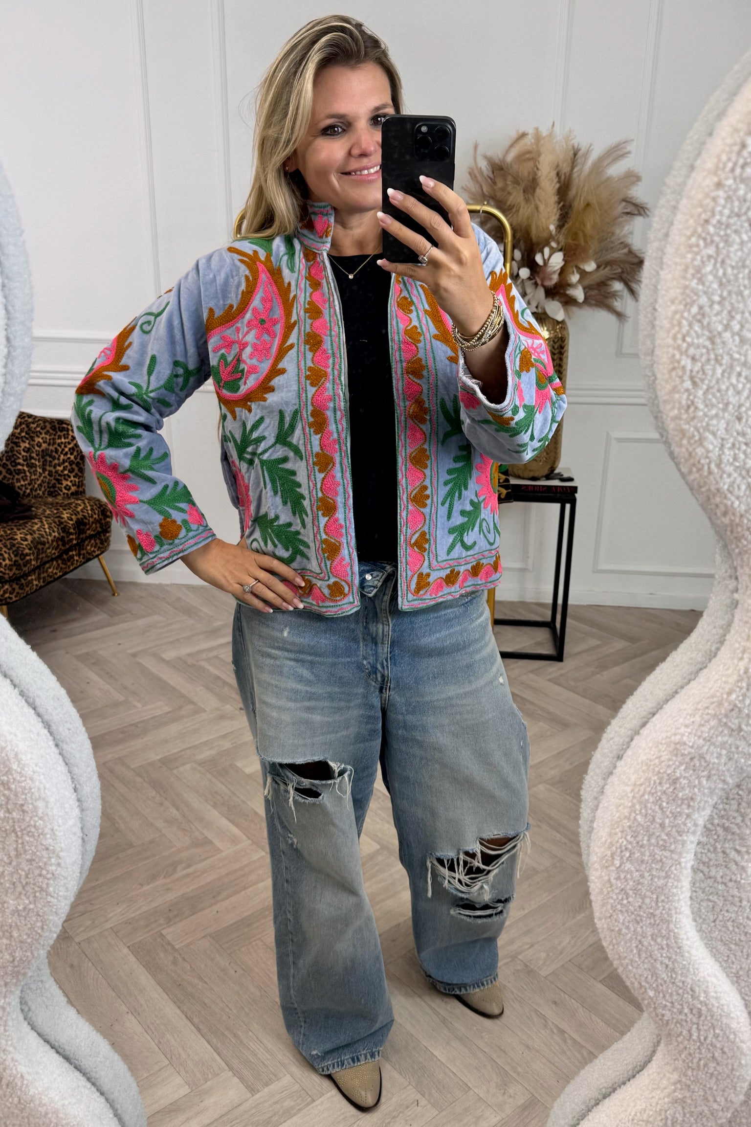 Dit mega leuke jasje is gemaakt van 100% katoen en heeft een velvet look! Dit exemplaar heeft een mooie flames print. Shop hem nu in light blue!