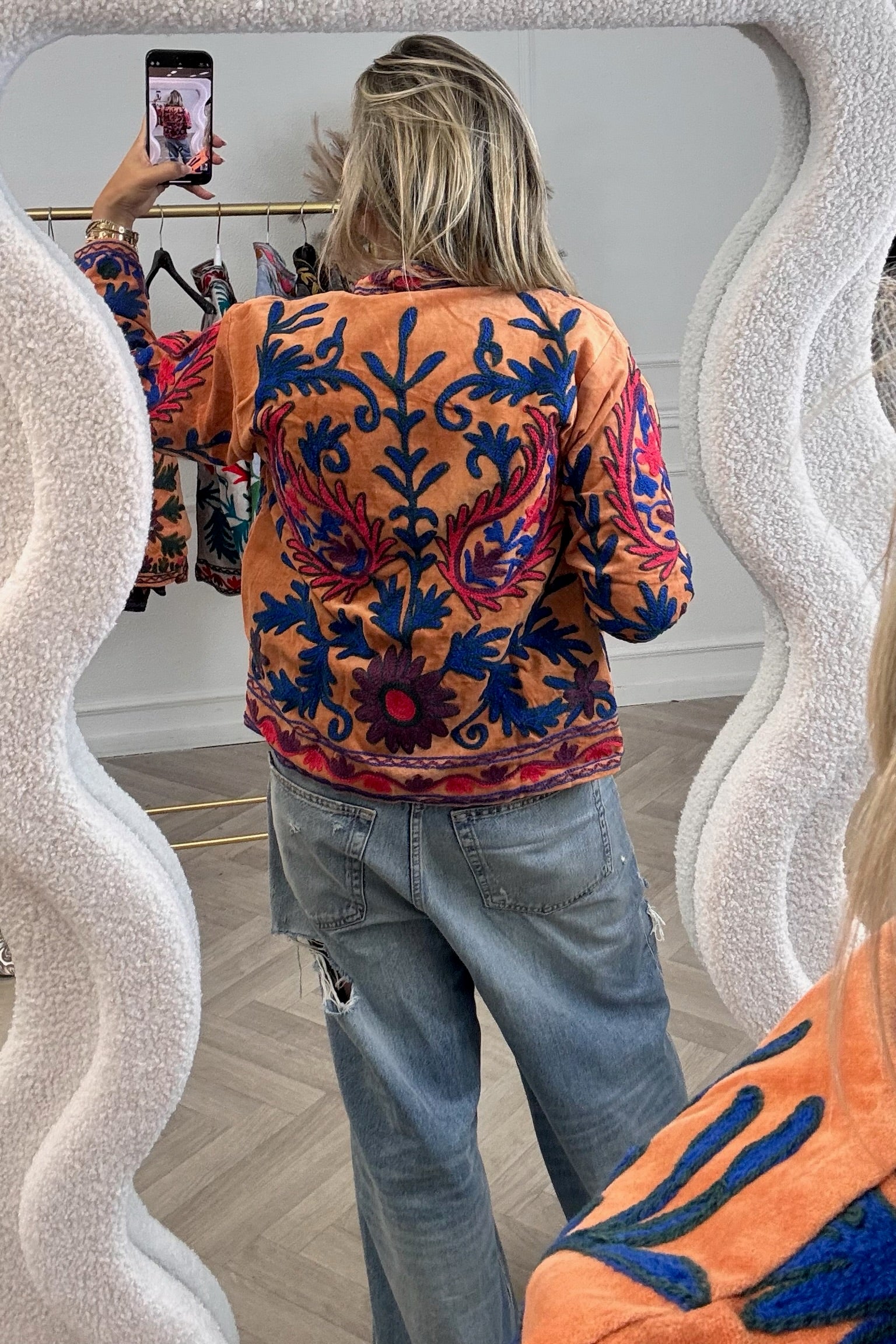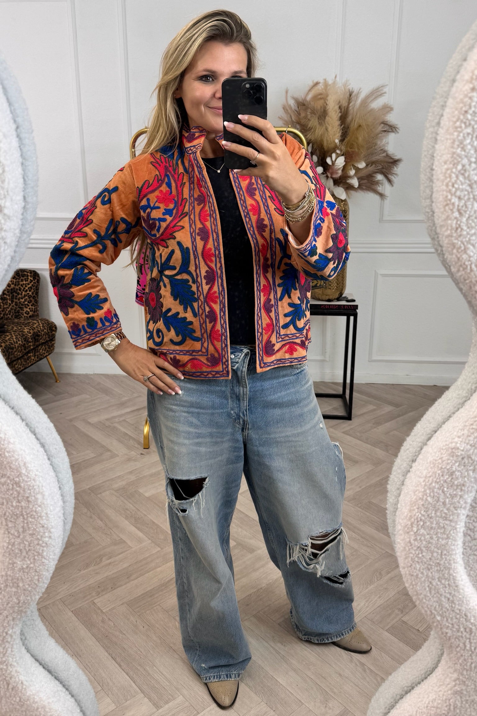 Dit mega leuke jasje is gemaakt van 100% katoen en heeft een velvet look! Dit exemplaar heeft een mooie flames print. Shop hem nu in orange/blue!