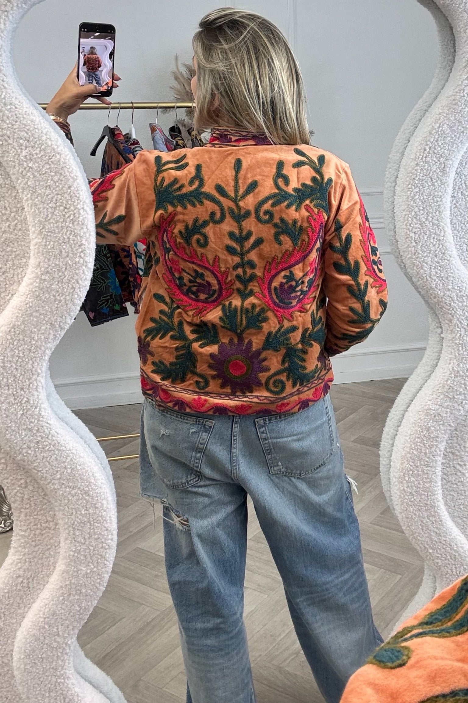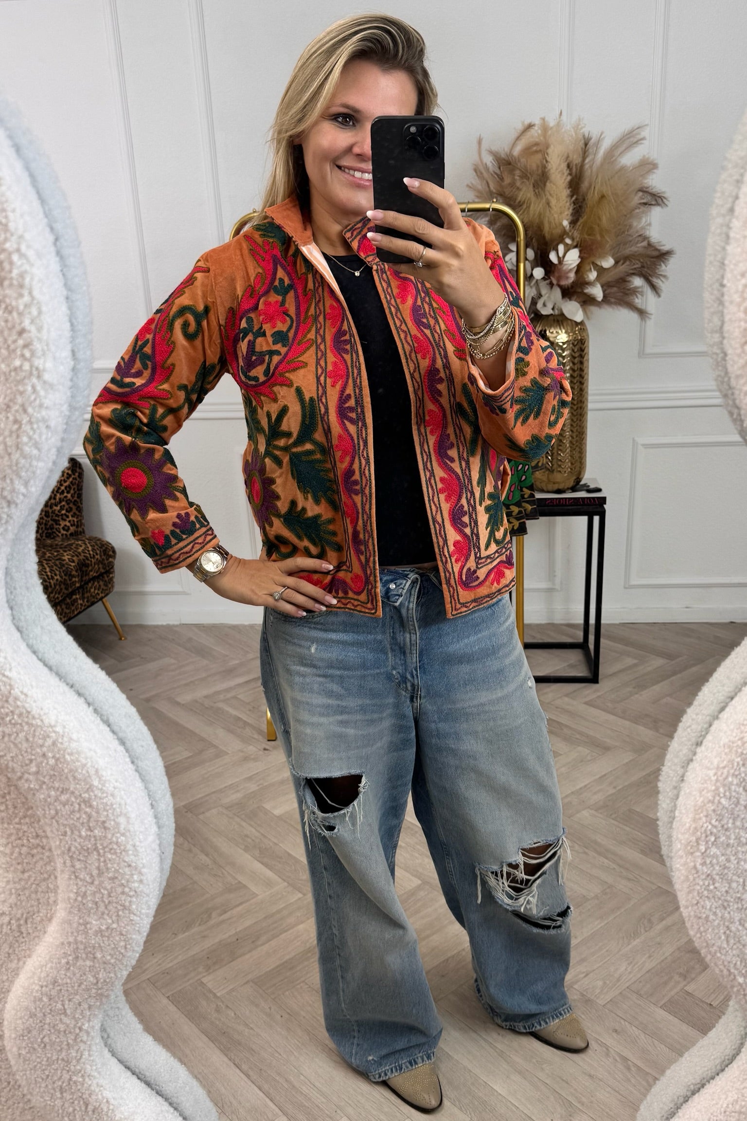 Dit mega leuke jasje is gemaakt van 100% katoen en heeft een velvet look! Dit exemplaar heeft een mooie flames print. Shop hem nu in orange/blue!