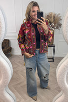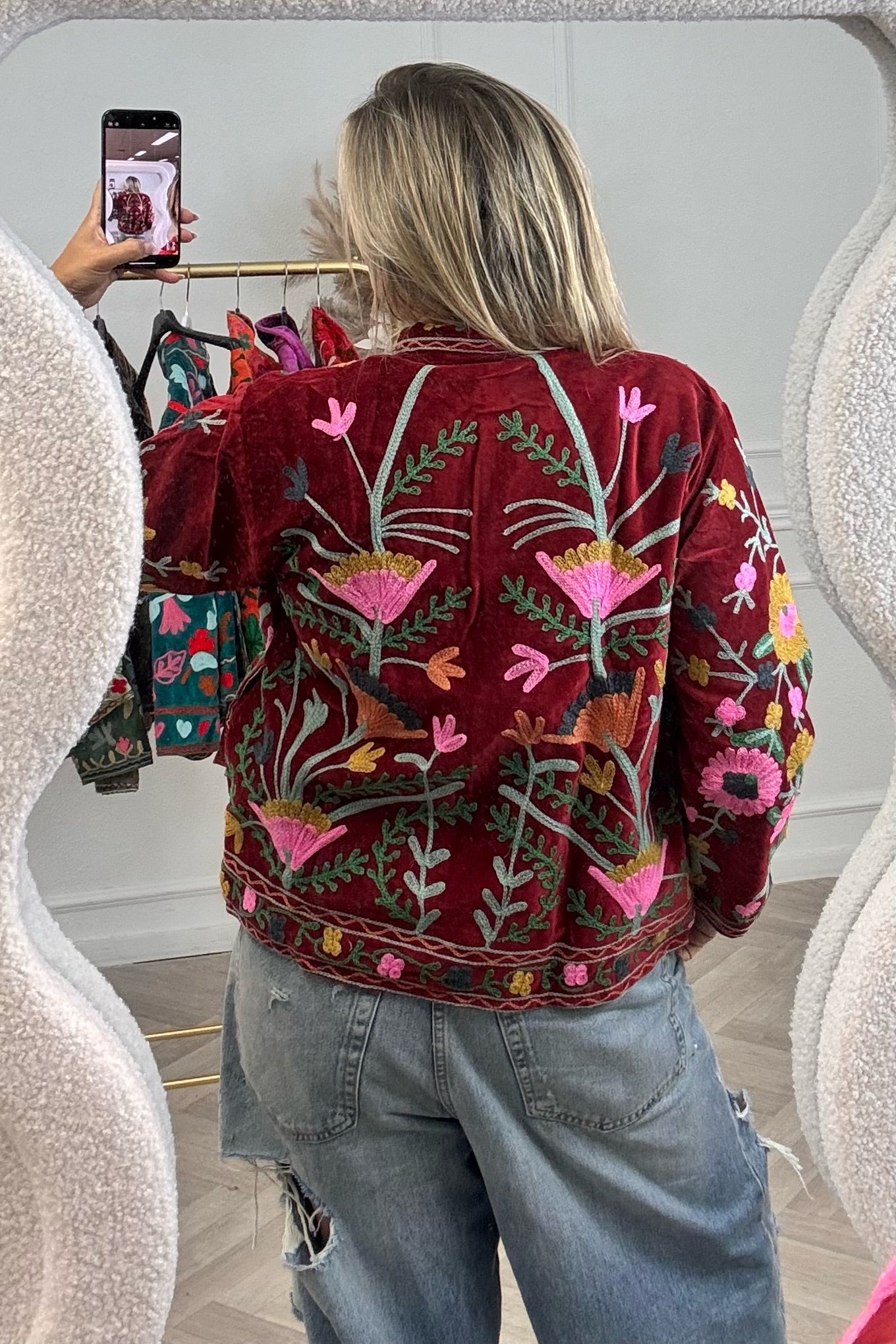 Dit mega leuke jasje is gemaakt van 100% katoen en heeft een velvet look! Dit exemplaar heeft een mooie lily print. Shop hem nu in red!
