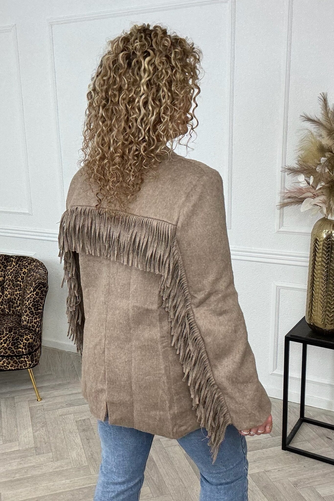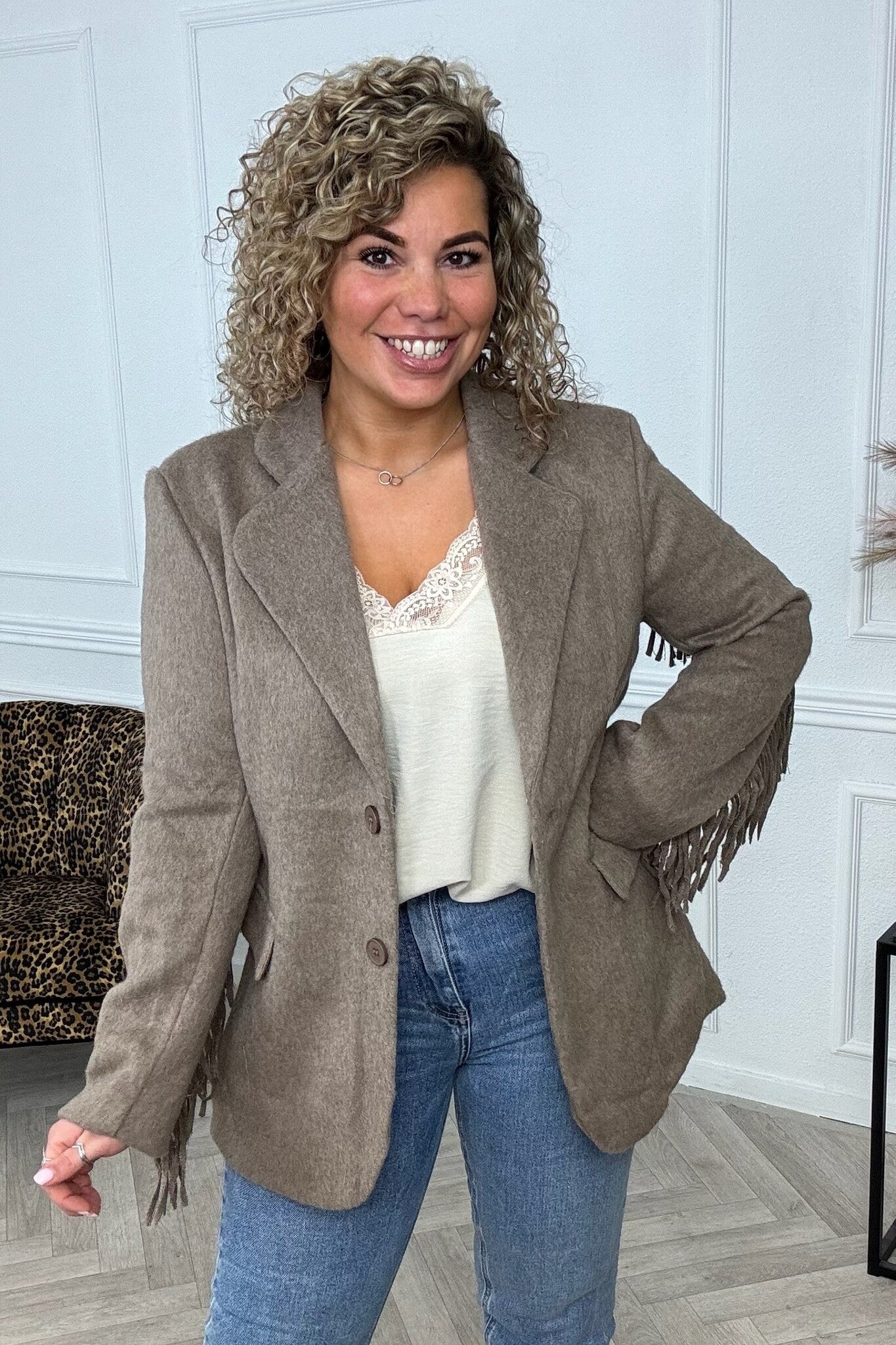 We hebben een mooie nieuwe blazer jacket met franjes verwerkt, een kleine split aan de achter kant. We love it! Shop hem nu in khaki.