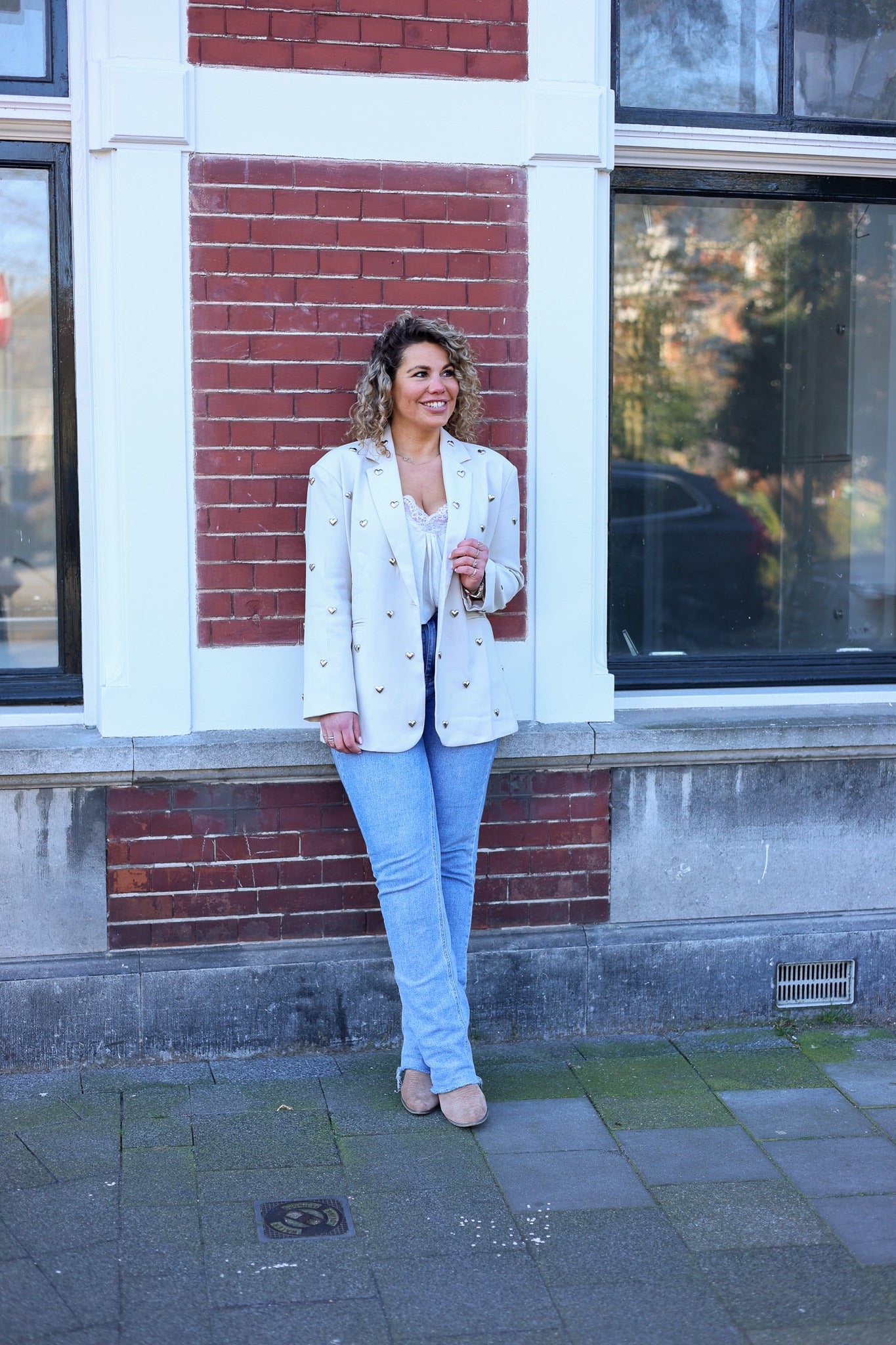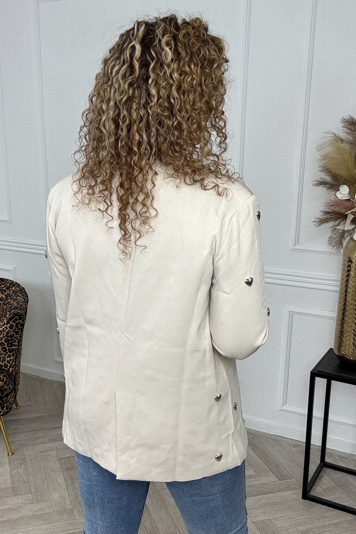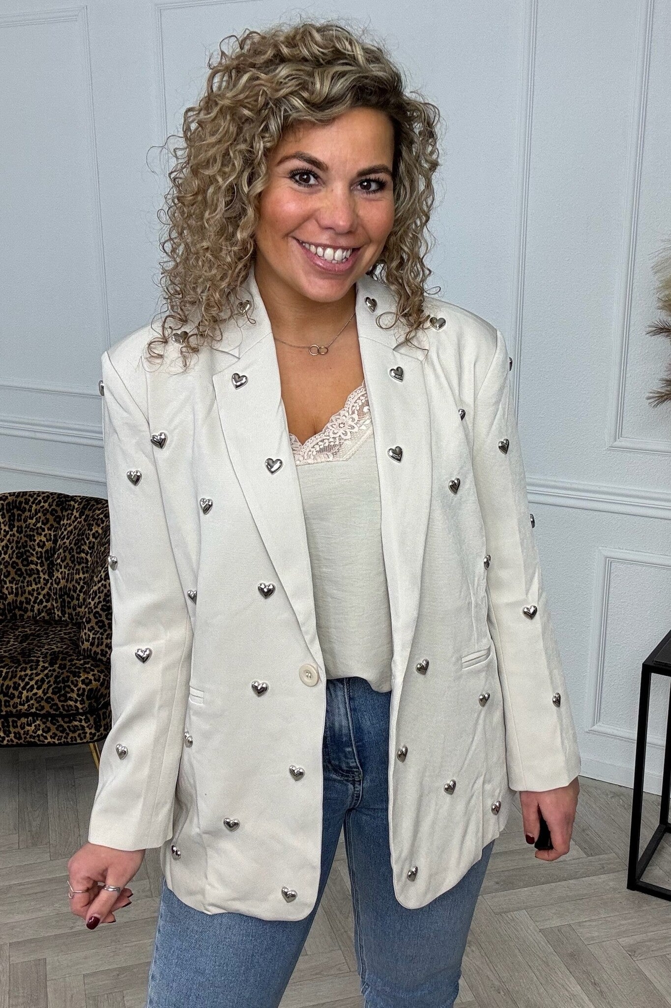 We love it! De zilveren hartjes geven deze blazer iets heel speciaals! Beautiful! Shop hem in beige!
