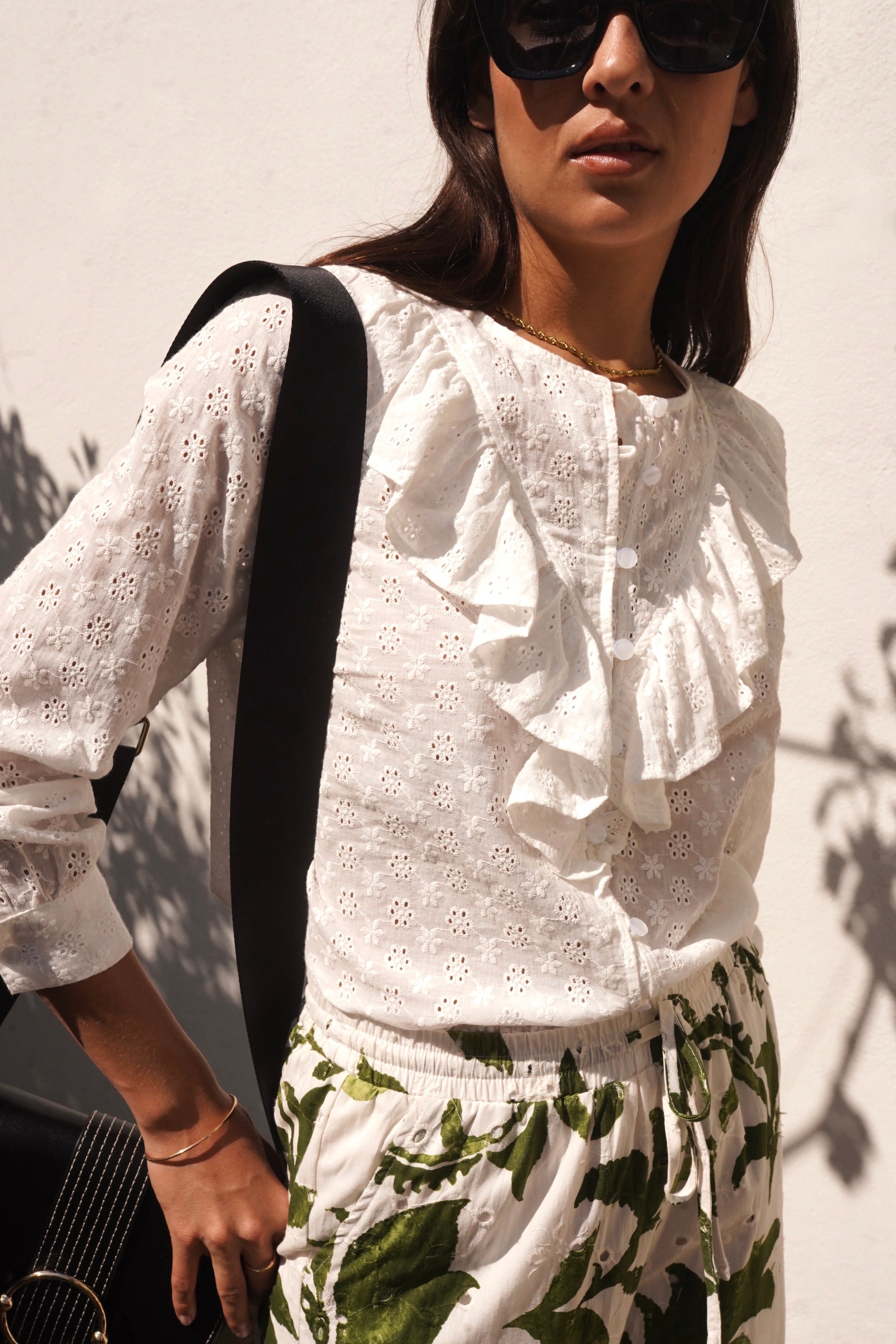 Deze mooie broderie blouse heeft ruffles en knoopjes, wij zijn gek op de details! Shop hem nu in white.