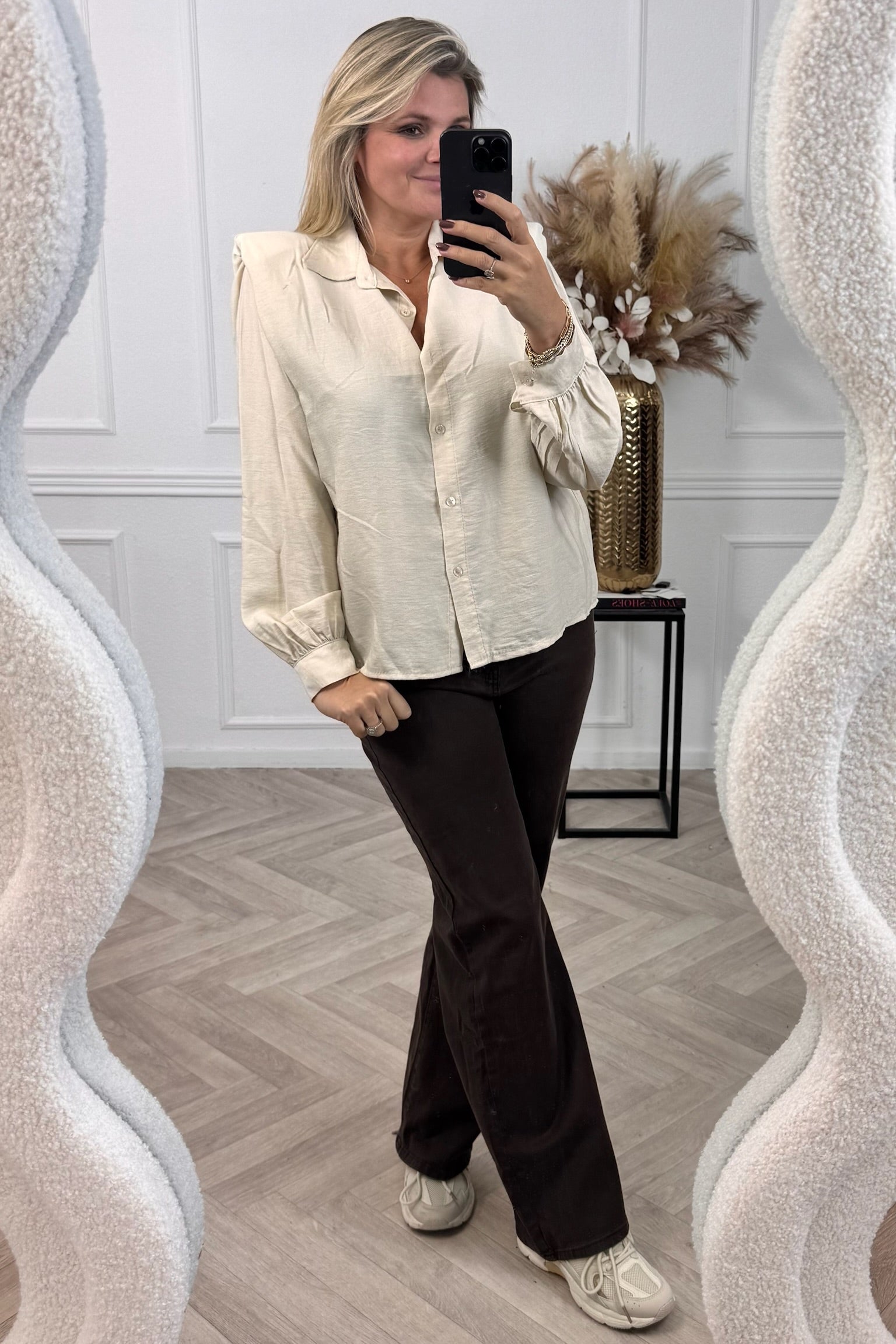 We hebben een prachtige nieuwe blouse met schoudervulling binnen! Shop de celeste shoulder blouse nu in beige!
