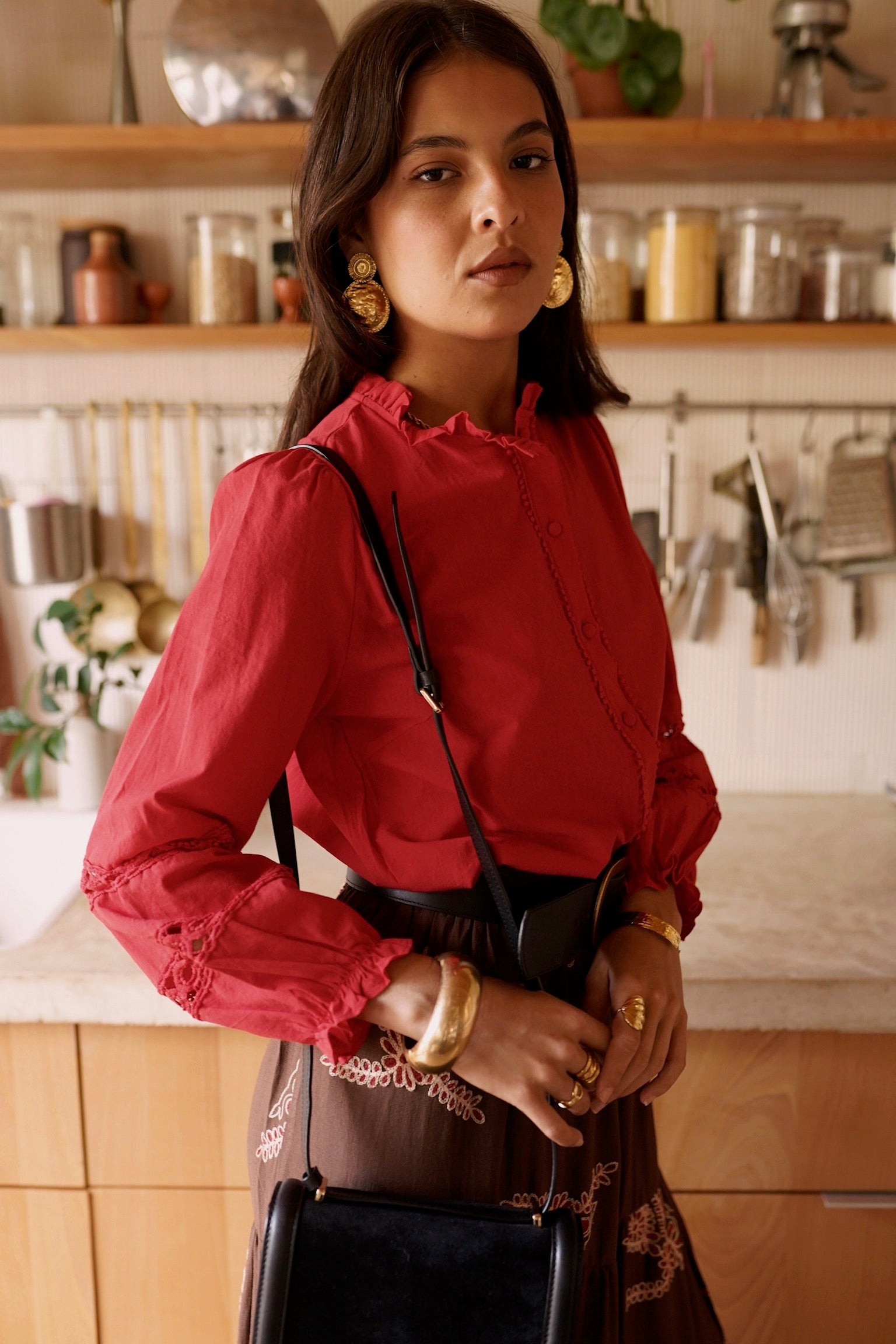 Deze mooie katoenen blouse heeft een knoopsluiting en mooie gehaakte details op de mouwen! Shop hem nu in Red.