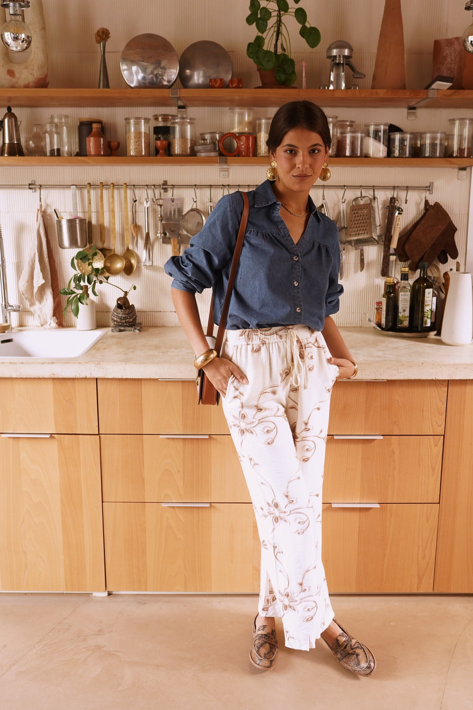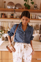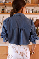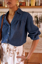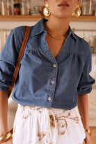 Deze leuke denim blouse heeft een knoopsluiting en een mooie V-hals. Shop hem in Blue!