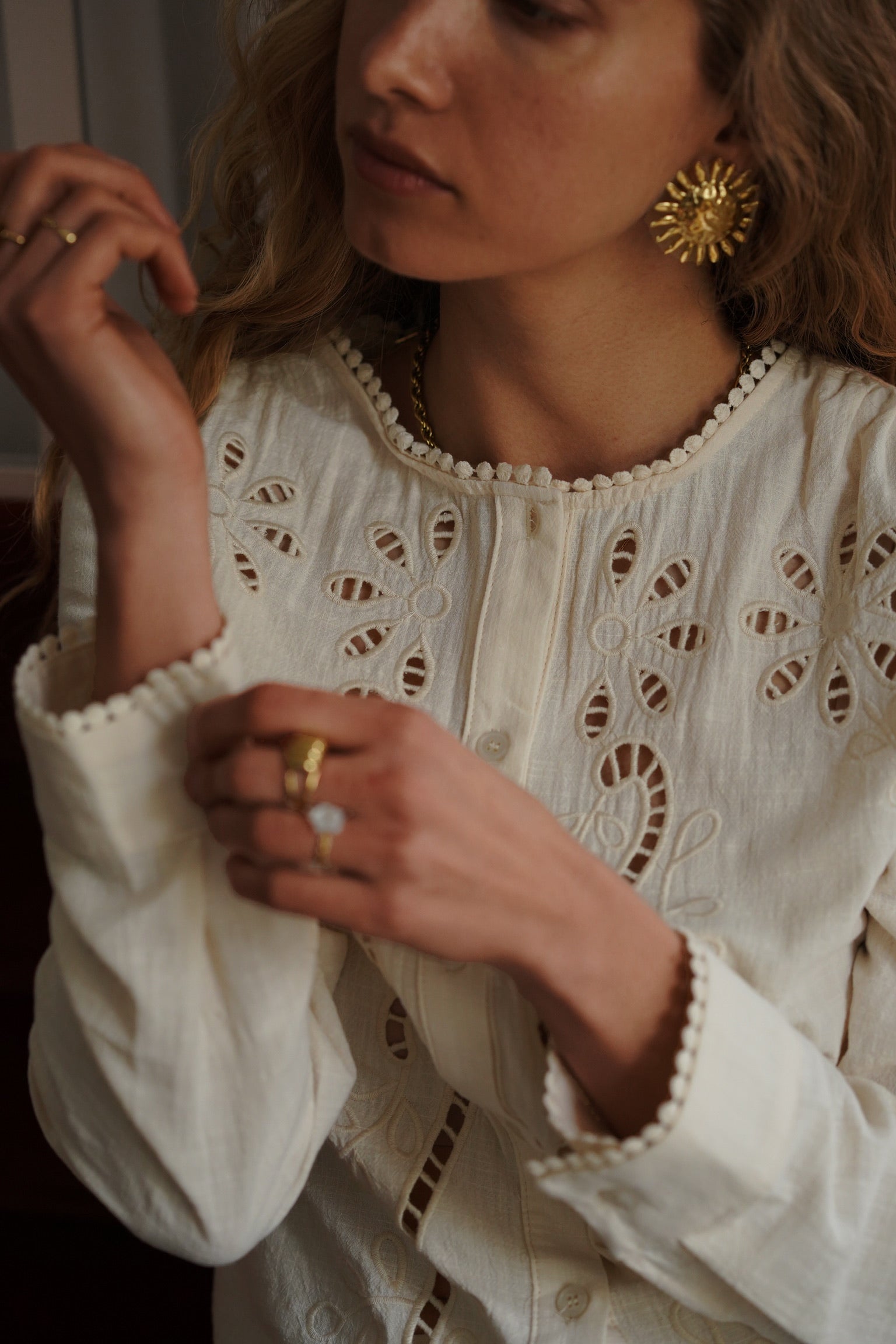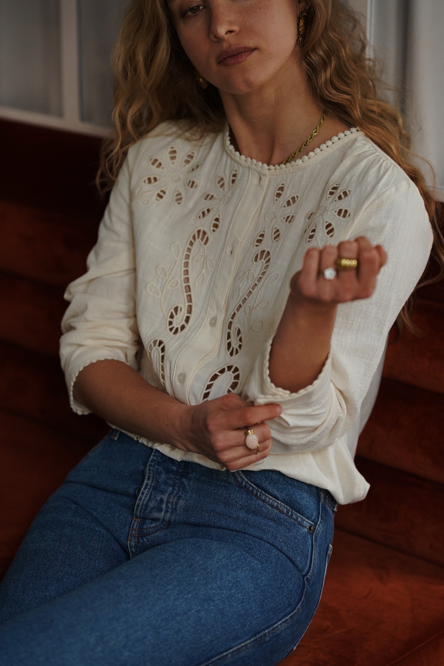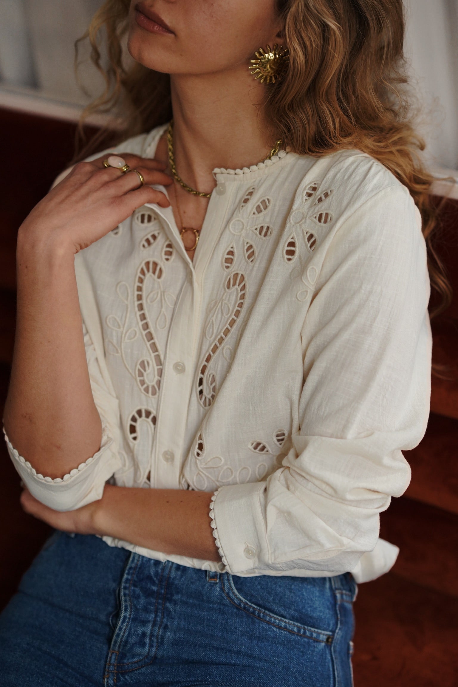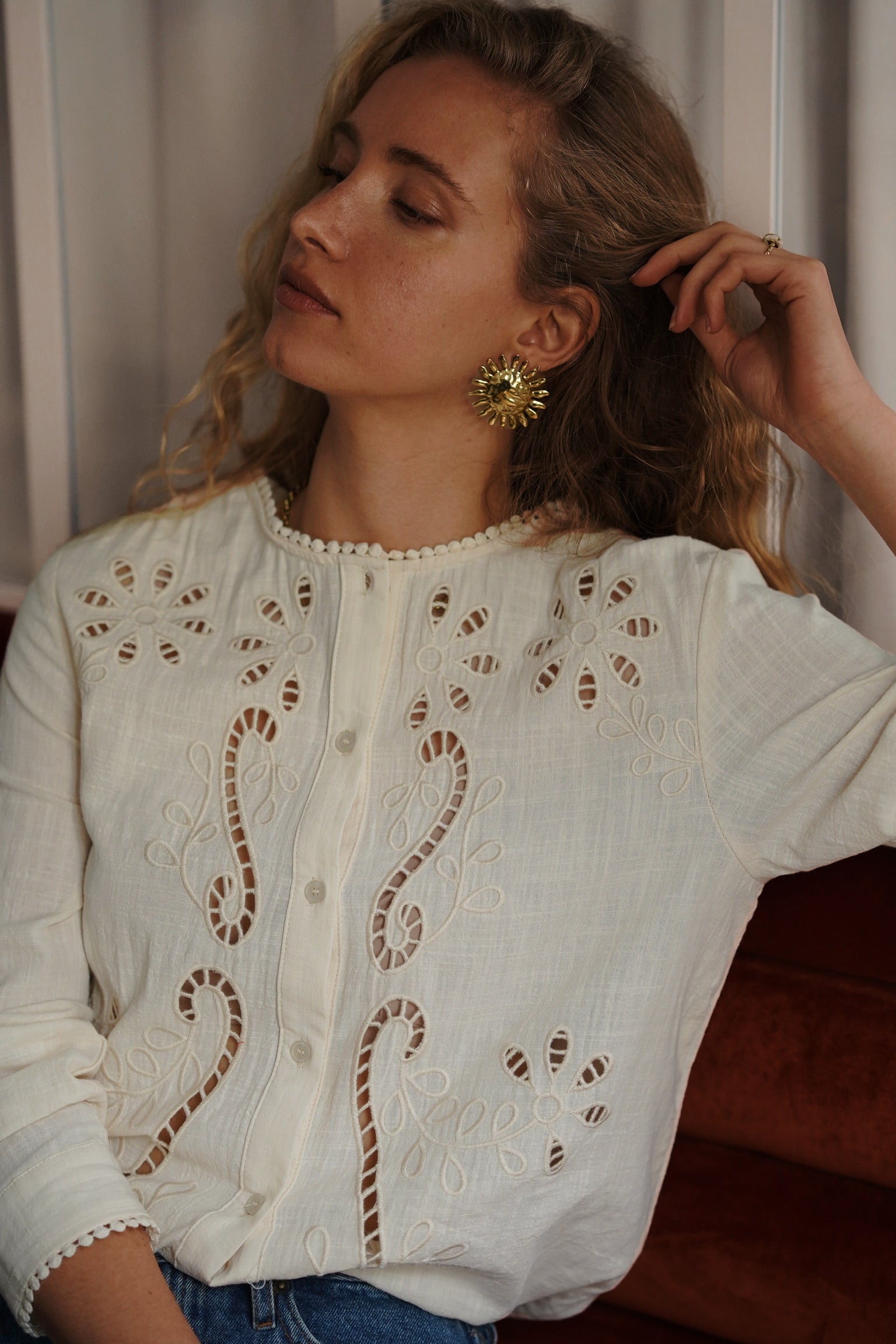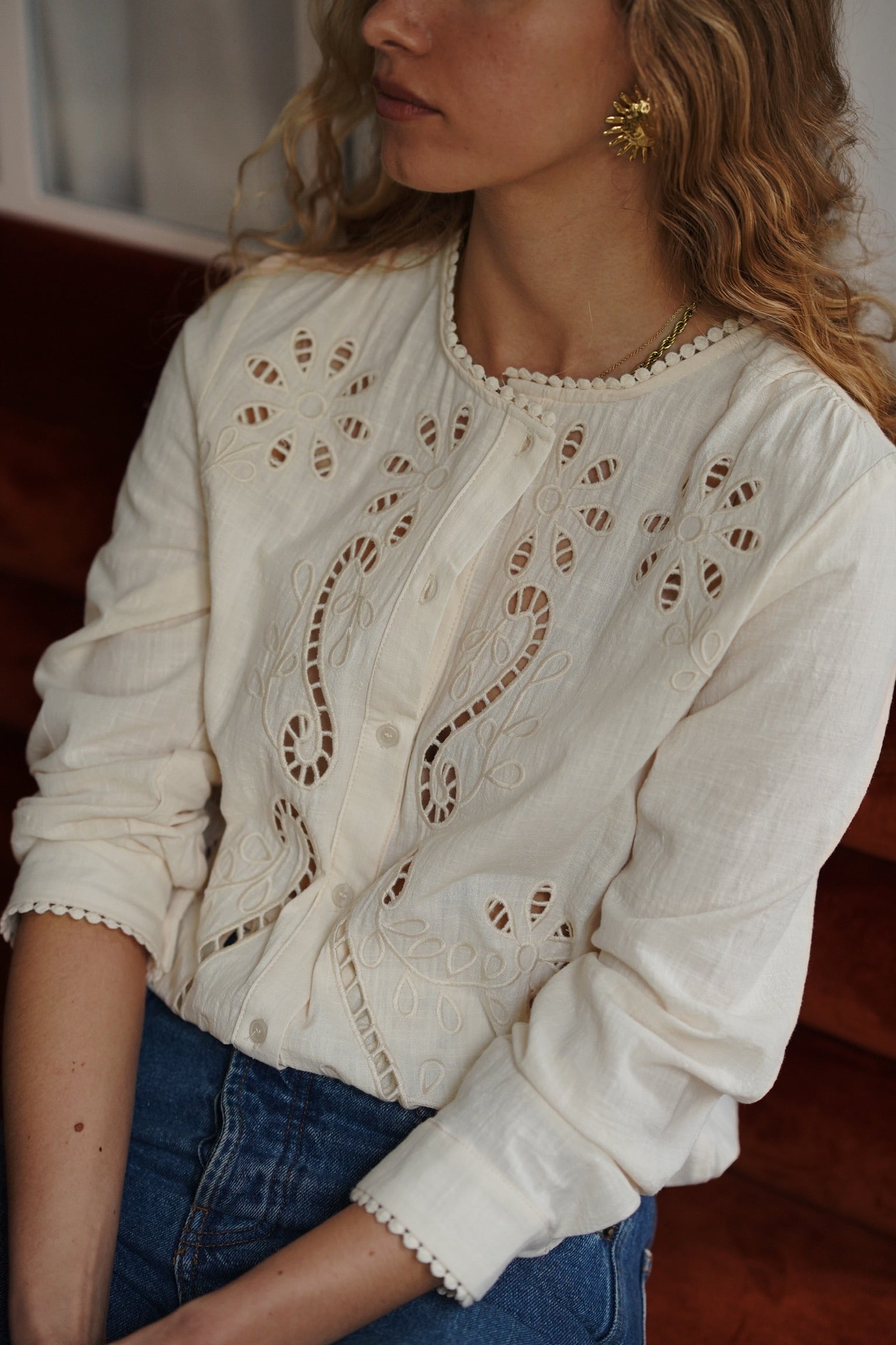 Deze mooie beige blouse met embroidered details heeft leuke details bij de mouwen en hals. Wow!