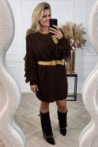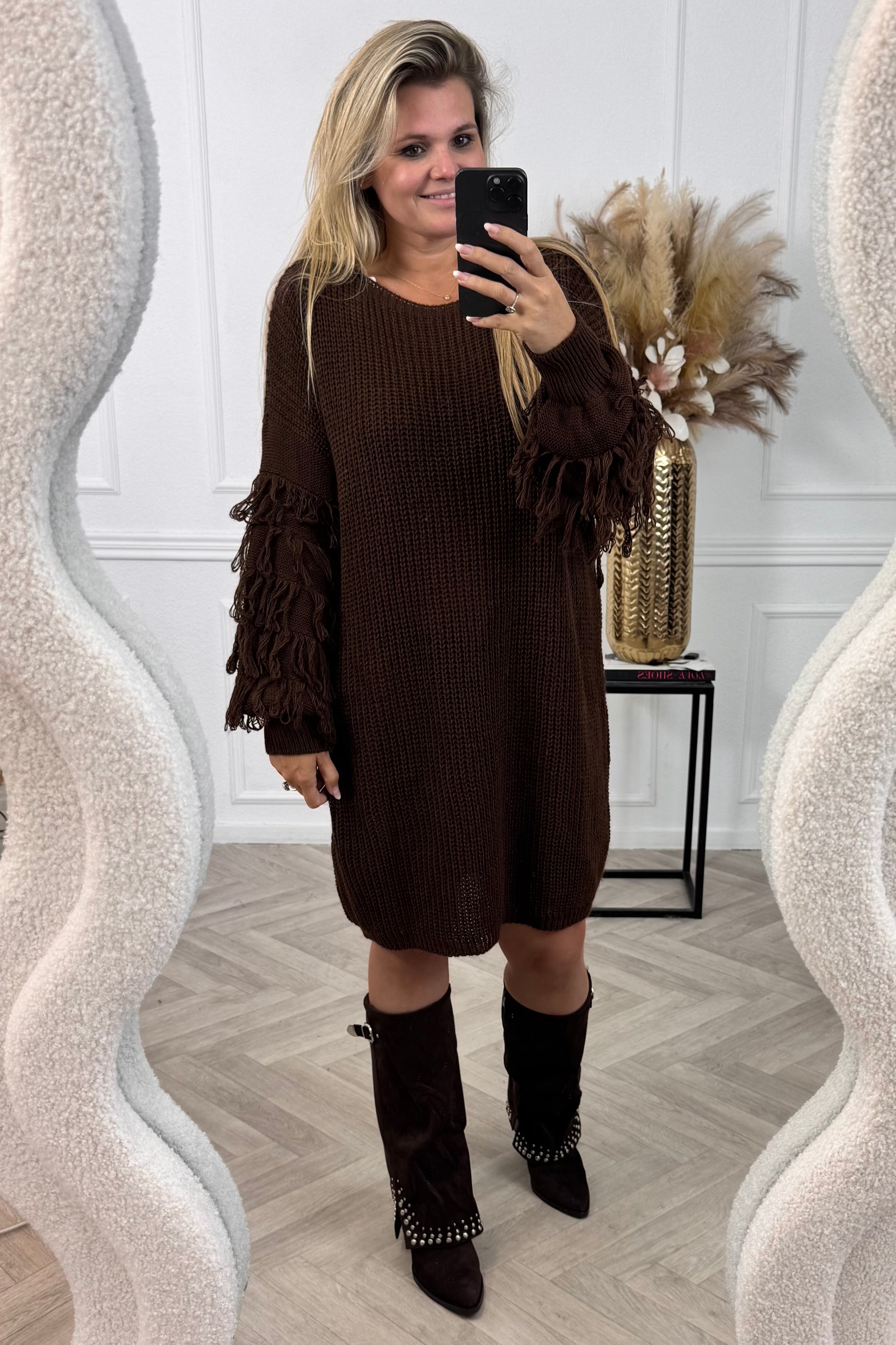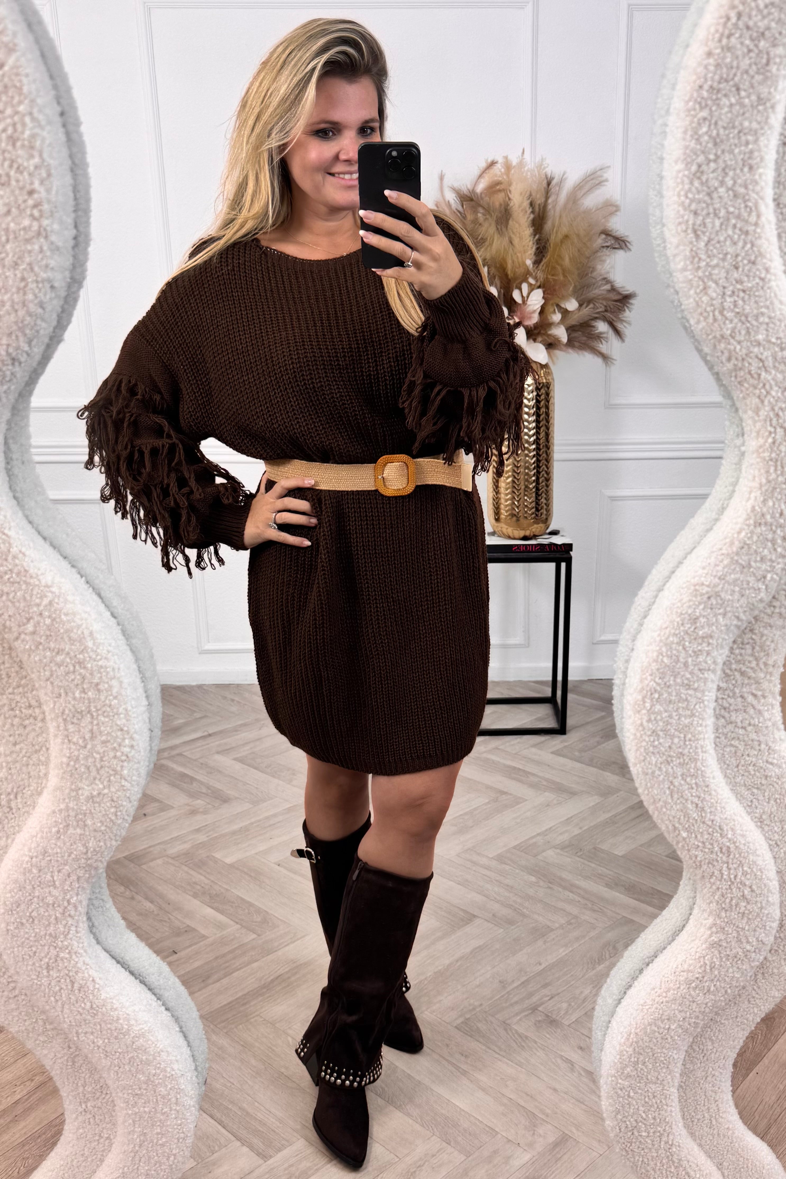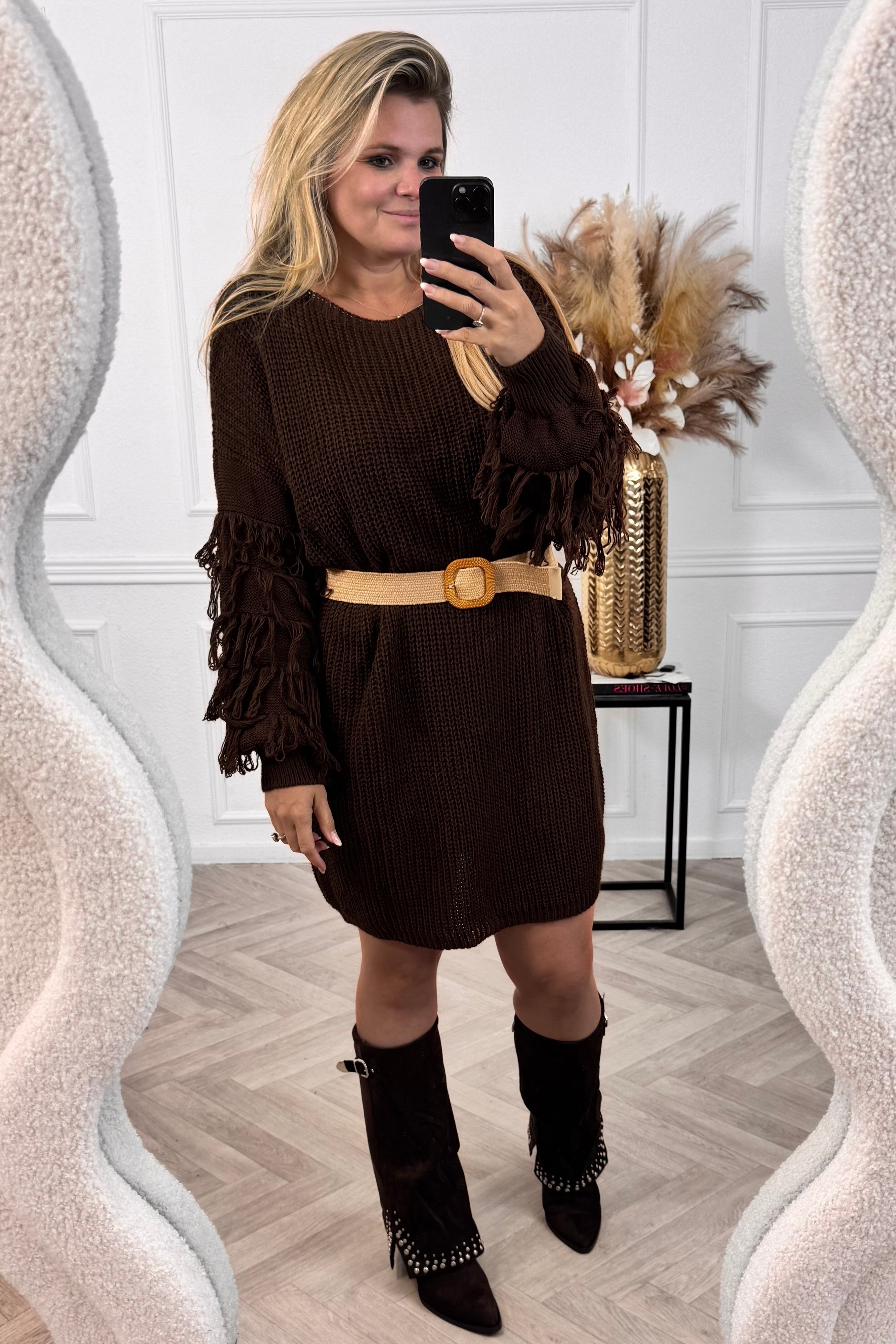 We hebben deze TE leuke jurk binnen gekregen! Enige fringe op de mauwen, en een optionele riem voor erbij in de taille. Shop deze fringe sleeve bet nu snel in brown!