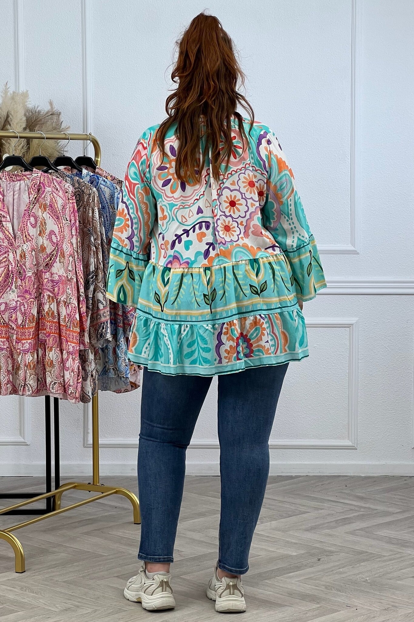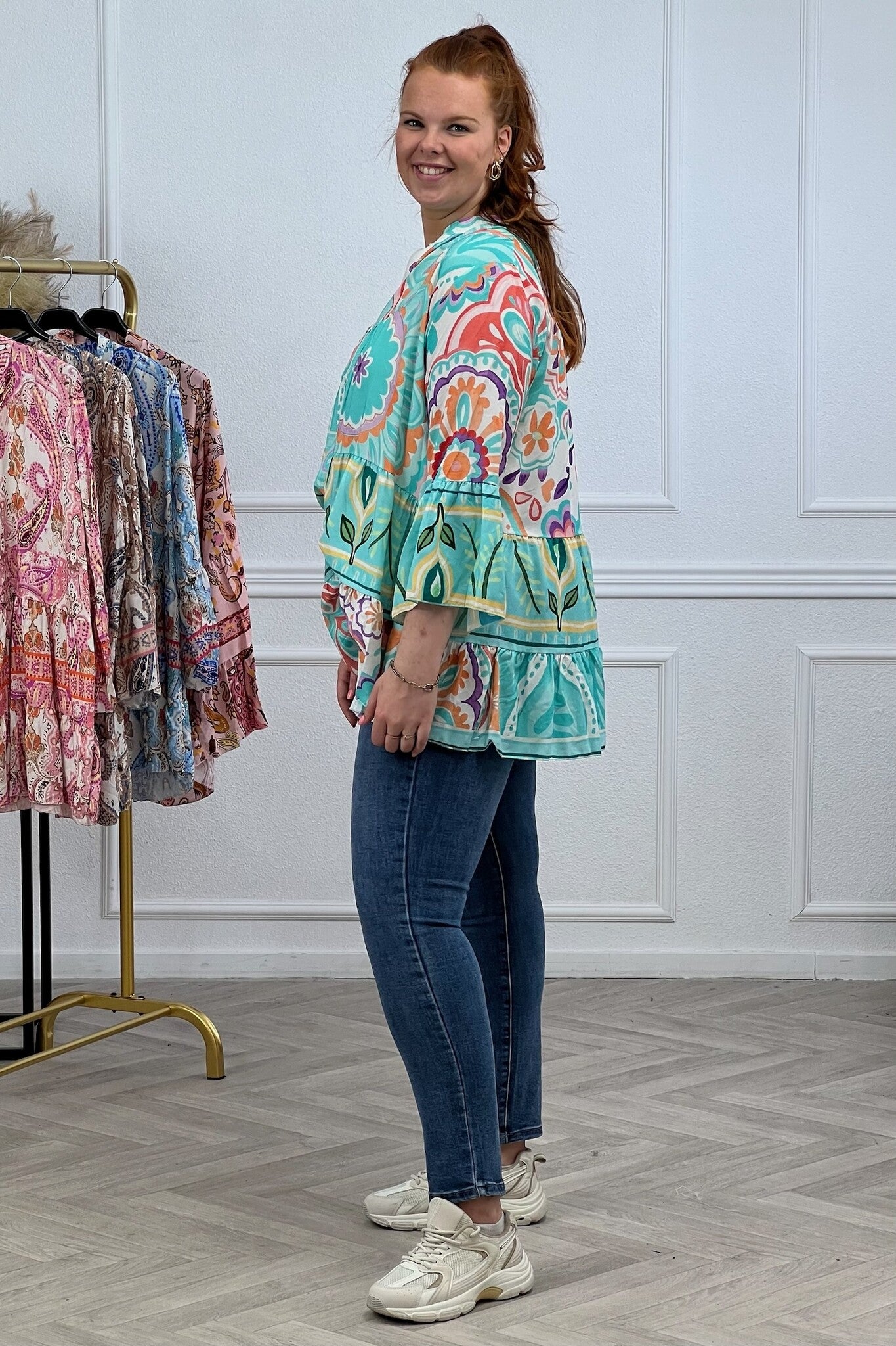 Deze prachtige blouse heeft een geweldige paisley patroon en knopen. Shop hem nu in Turquoise!