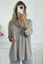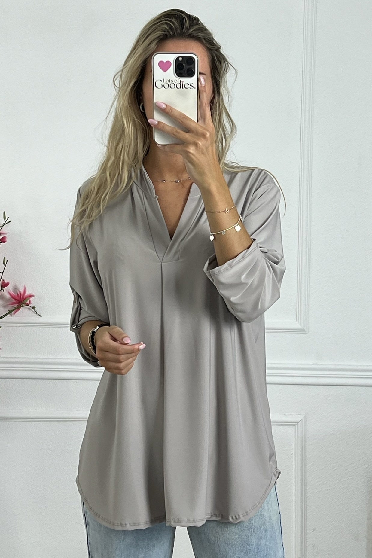 Een mooi blousje met V hals en een opgestroopt mouwtje met knoop! Je shopt ze in diverse kleuren en printjes, bijvoorbeeld lightgrey!