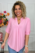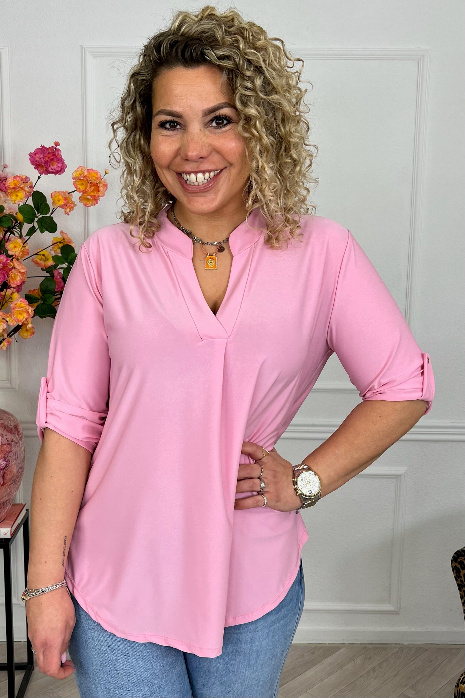 Een mooi blousje met V hals en een opgestroopt mouwtje! Super leuk voor de zomer! Shop hem in Sugar Pink!