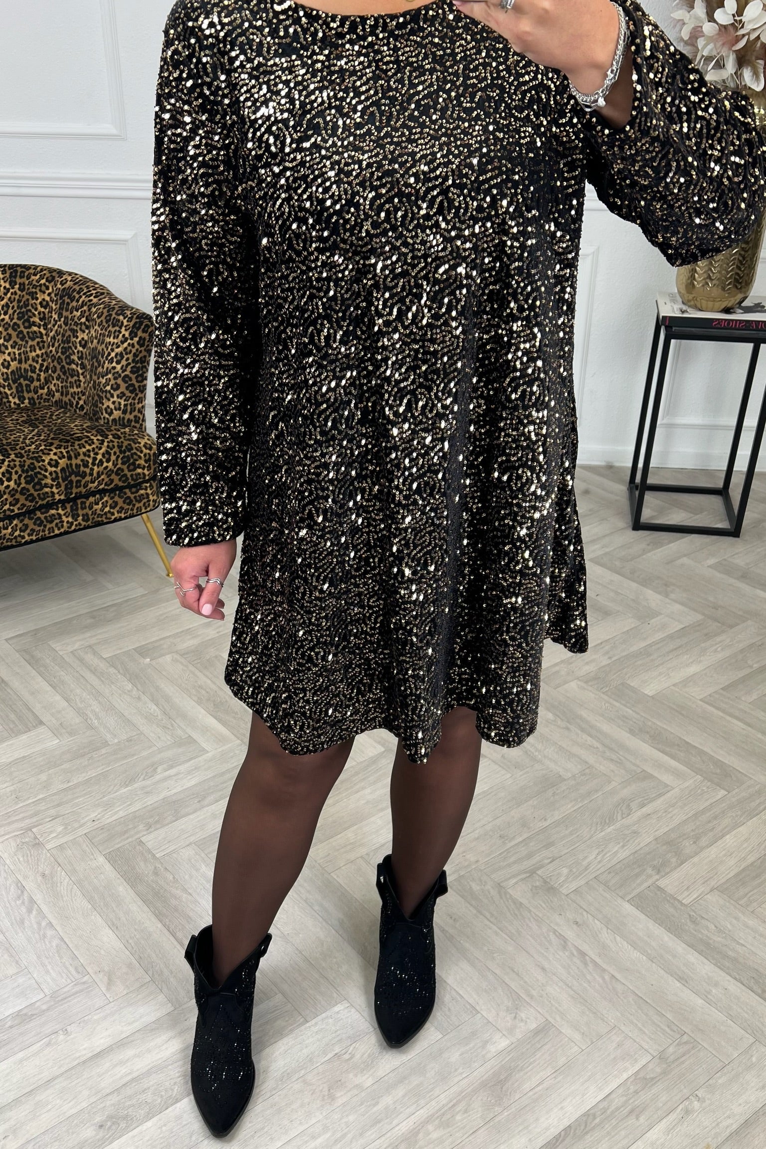 Hele leuke pailletten jurk met een strik op de achterkant! Perfect voor de feestdagen of gewoon voor zomaar ;) Shop nu de perfect bow glitter dress in het black/gold.