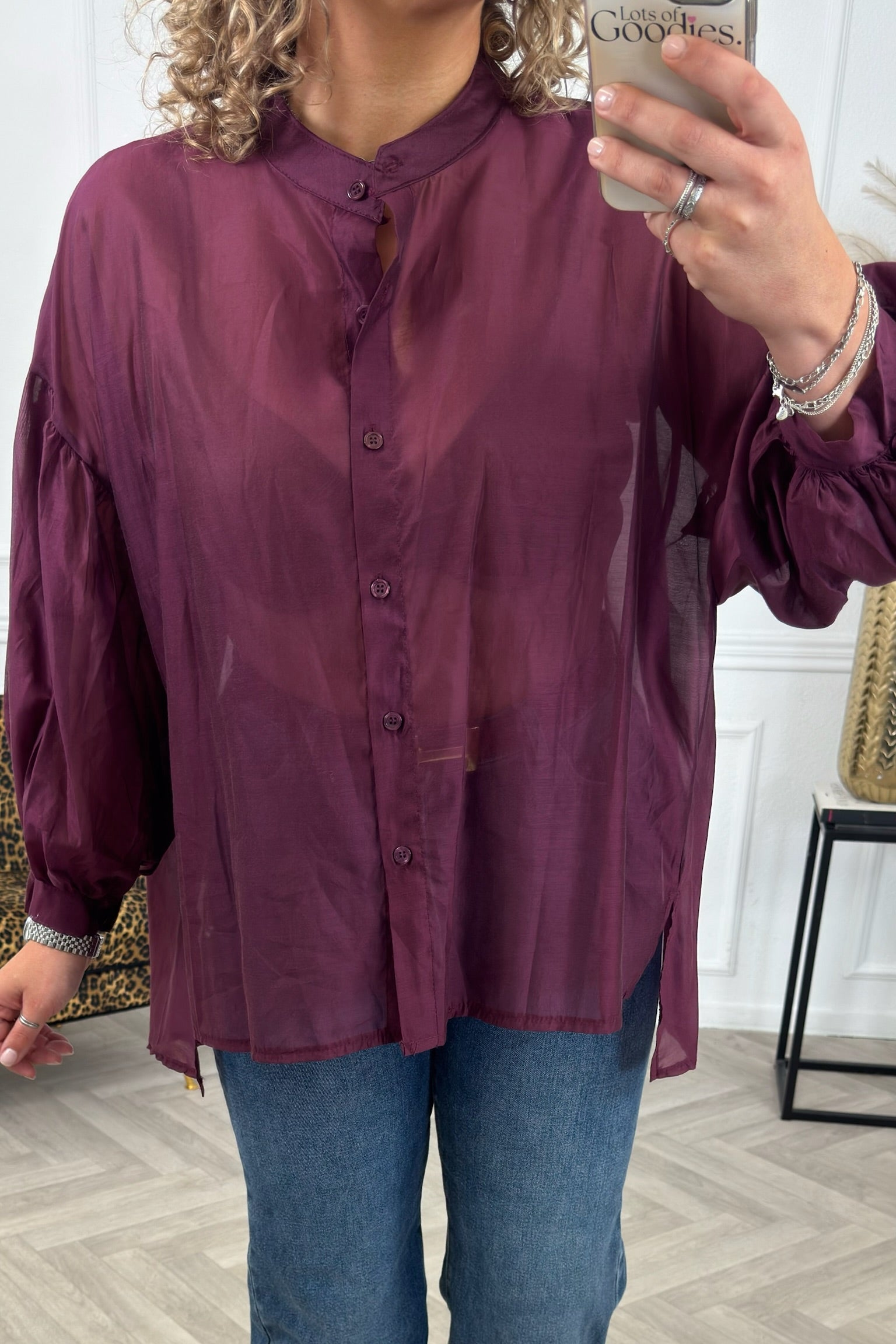 Hoe leuk is deze blouse?! Een beetje doorschijnend met mega leuke mouwen! Shop de sheere balloon sleeve blouse nu in bordeaux.
