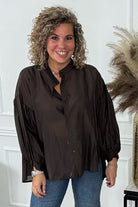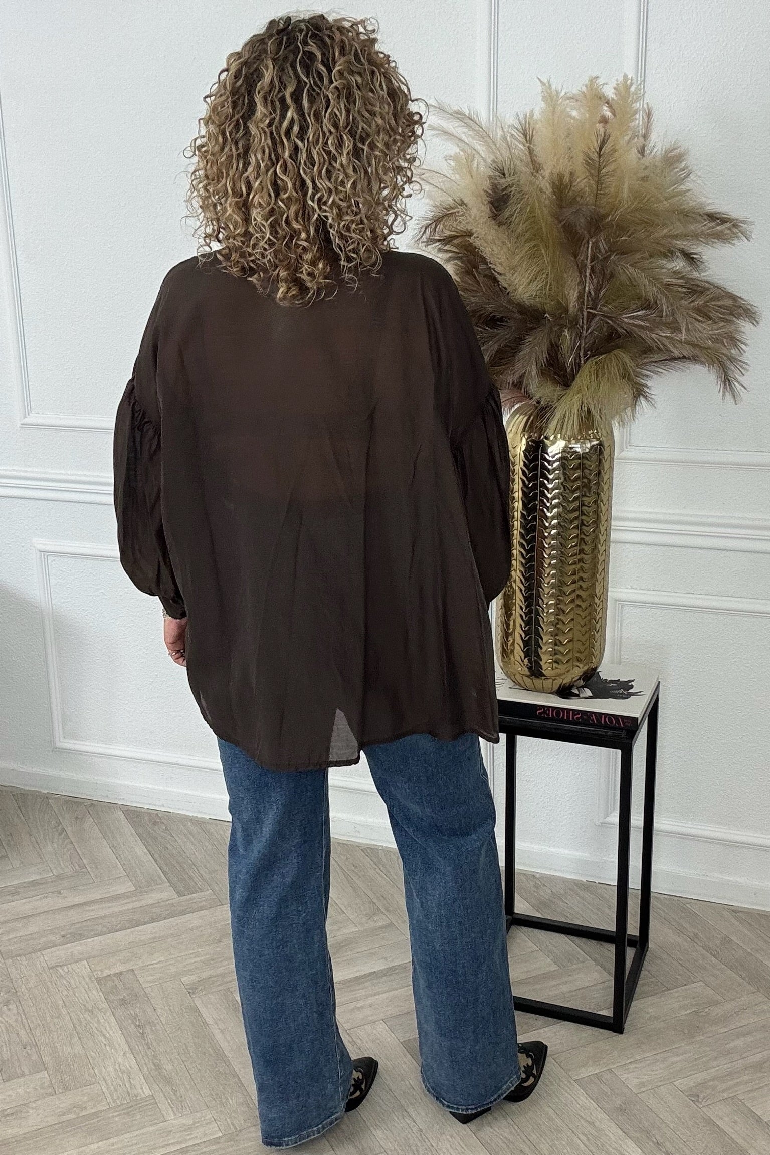 Hoe leuk is deze blouse?! Een beetje doorschijnend met mega leuke mouwen! Shop de sheere balloon sleeve blouse nu in brown.