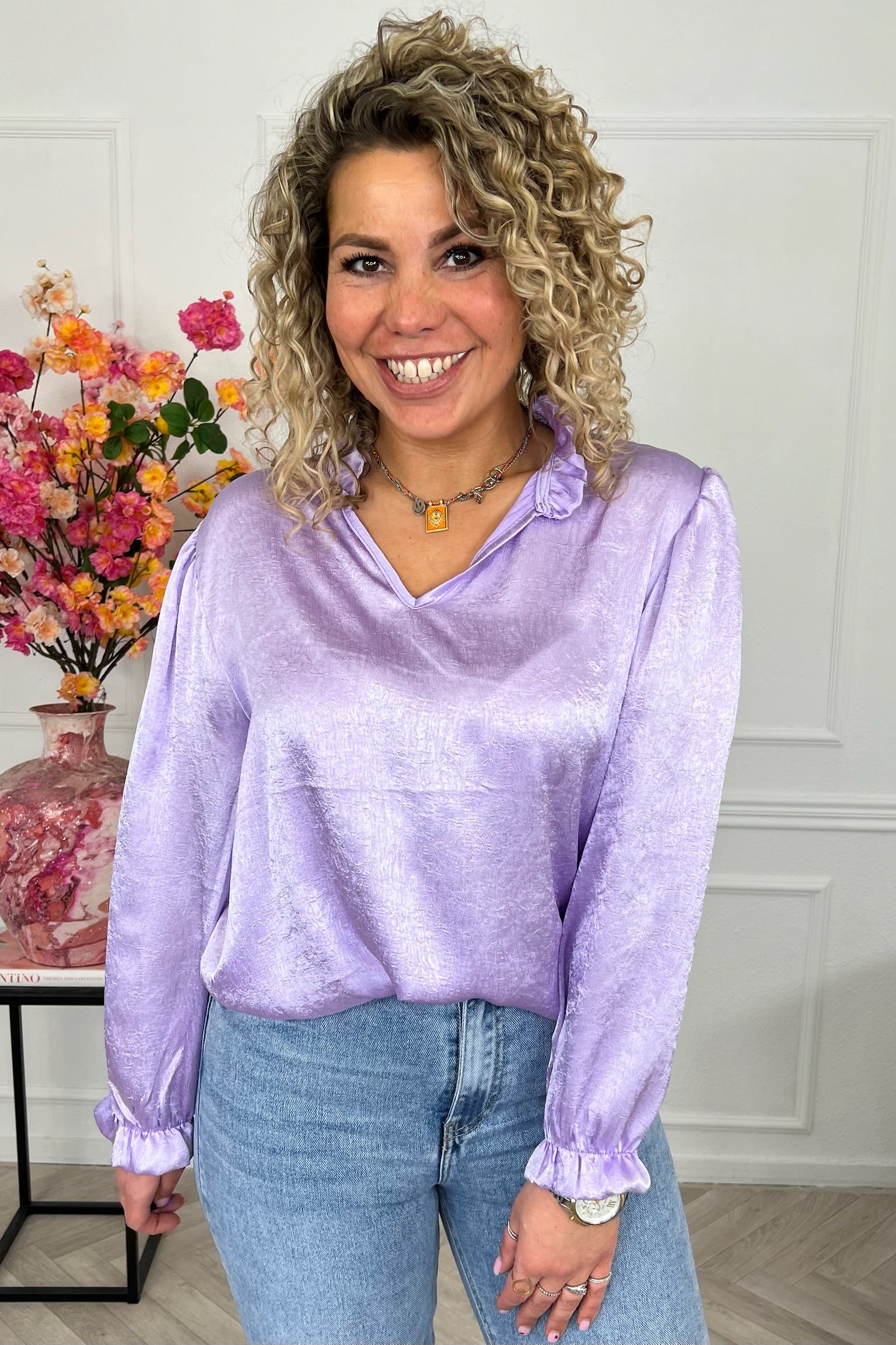 Silky en shiny! Deze fijne blouse is heerlijke luchtig en staat fantastisch! Shop hem in lila!