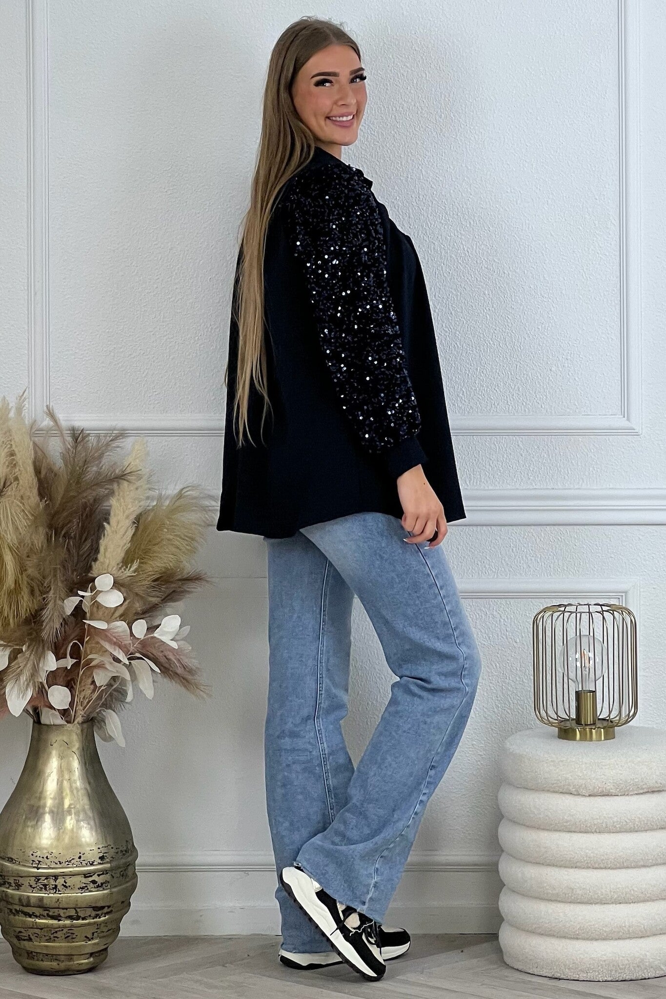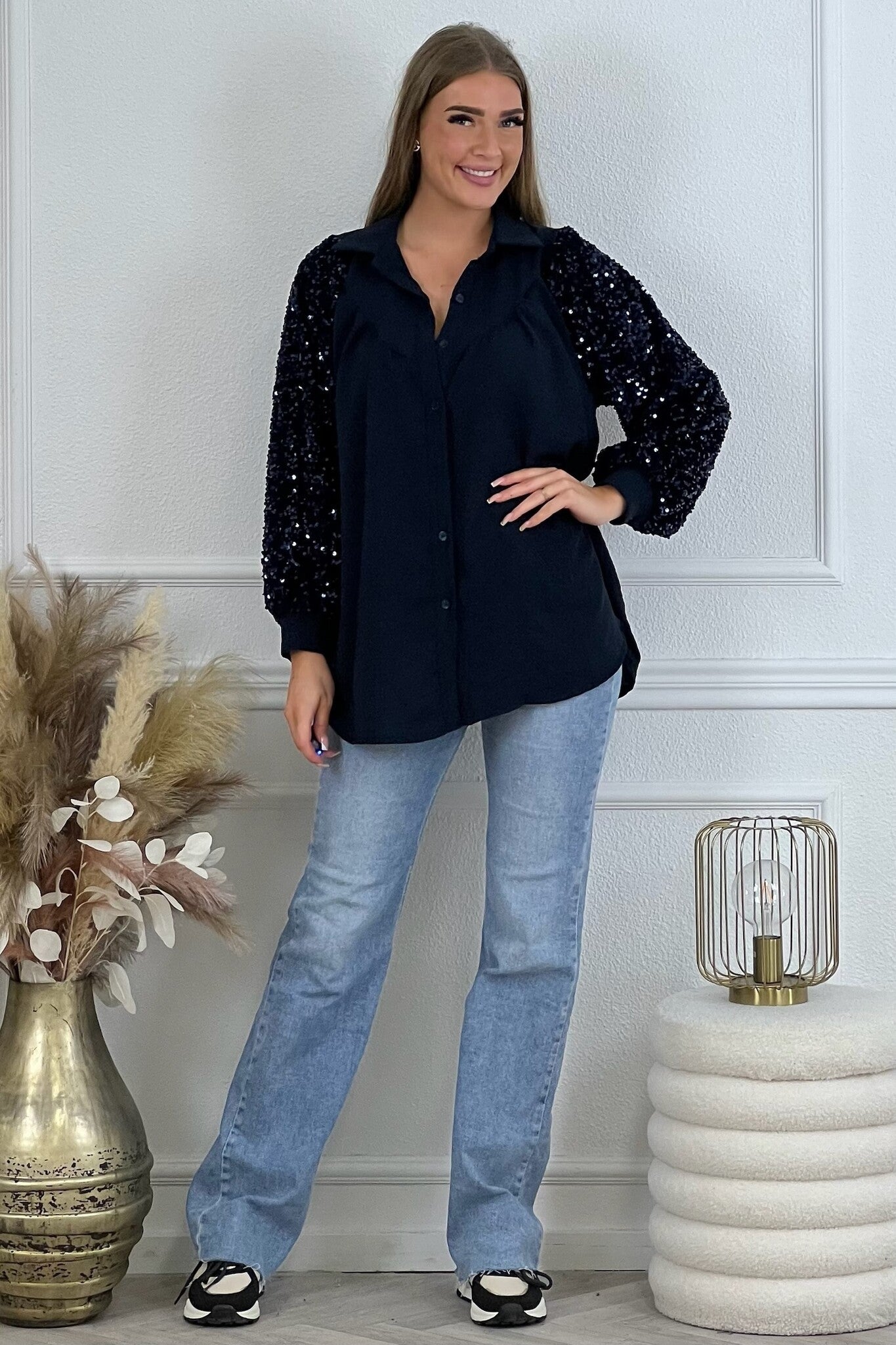 We hebben een super leuke blouse binnen met glitters. Ideaal voor de feestdagen! Shop hem nu in navy.
