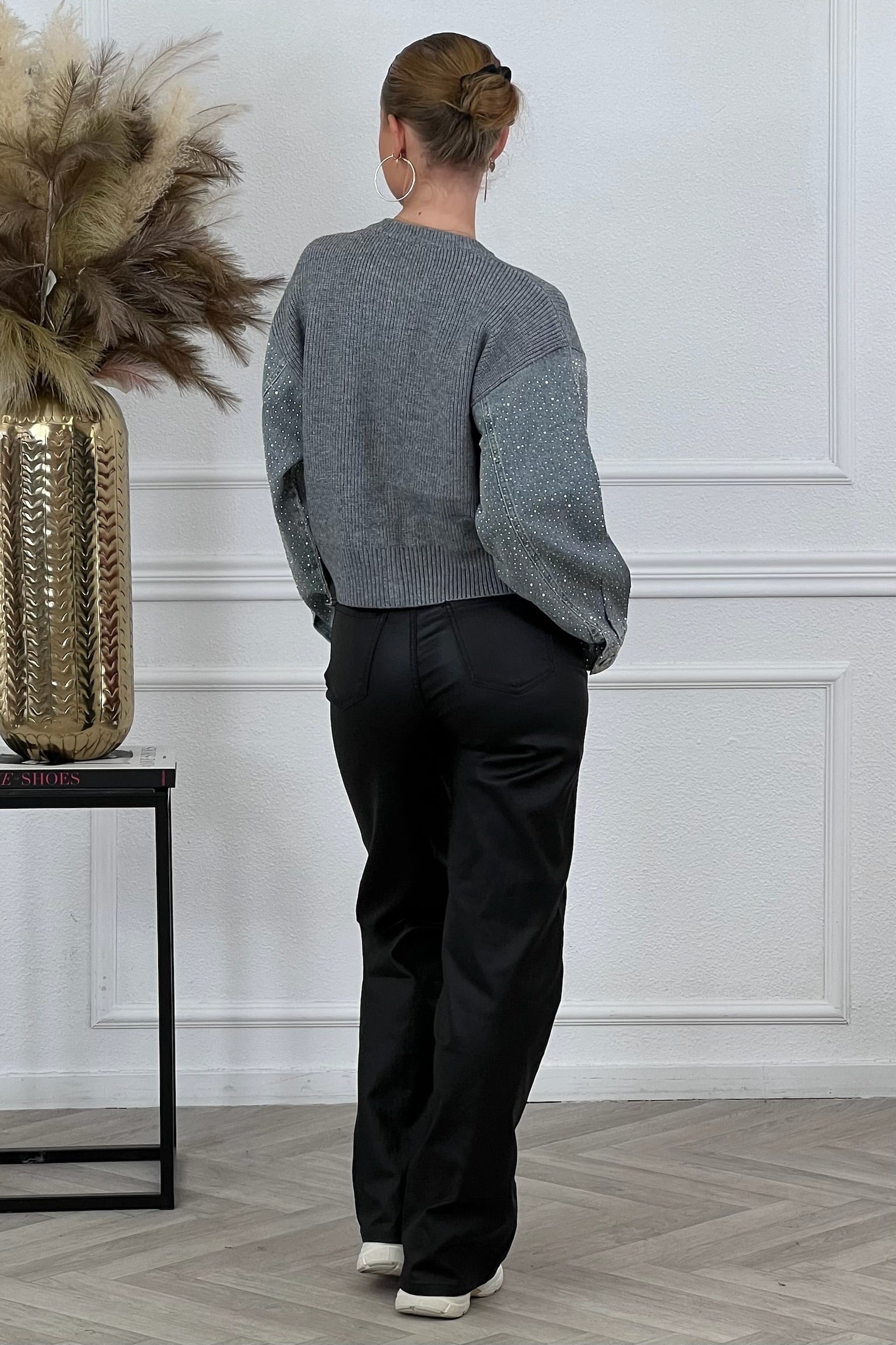 Een heerlijk comfy vest, maar afgemaakt met super gave denim mauwen met glitters er op! Shop hem nu snel in grey!