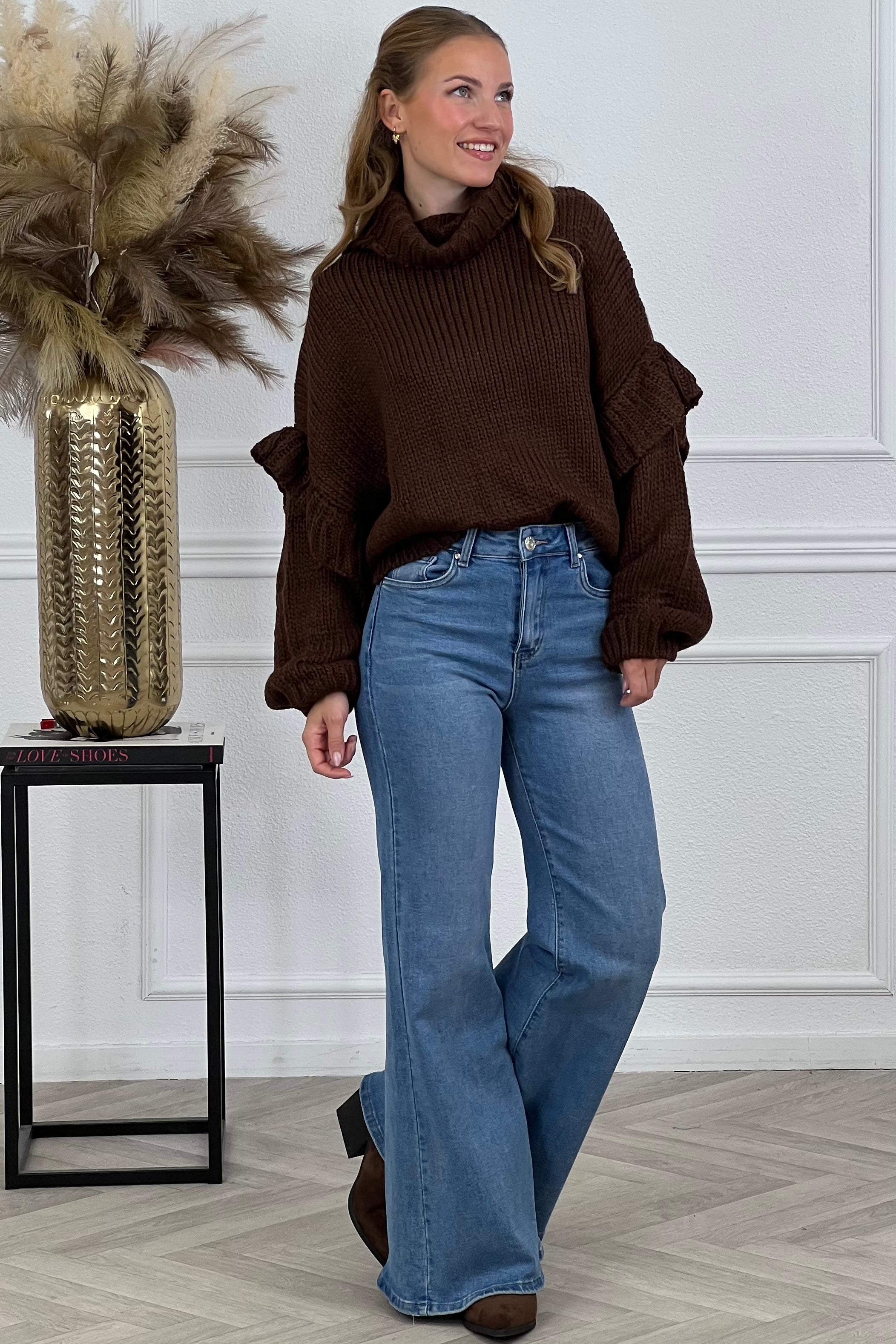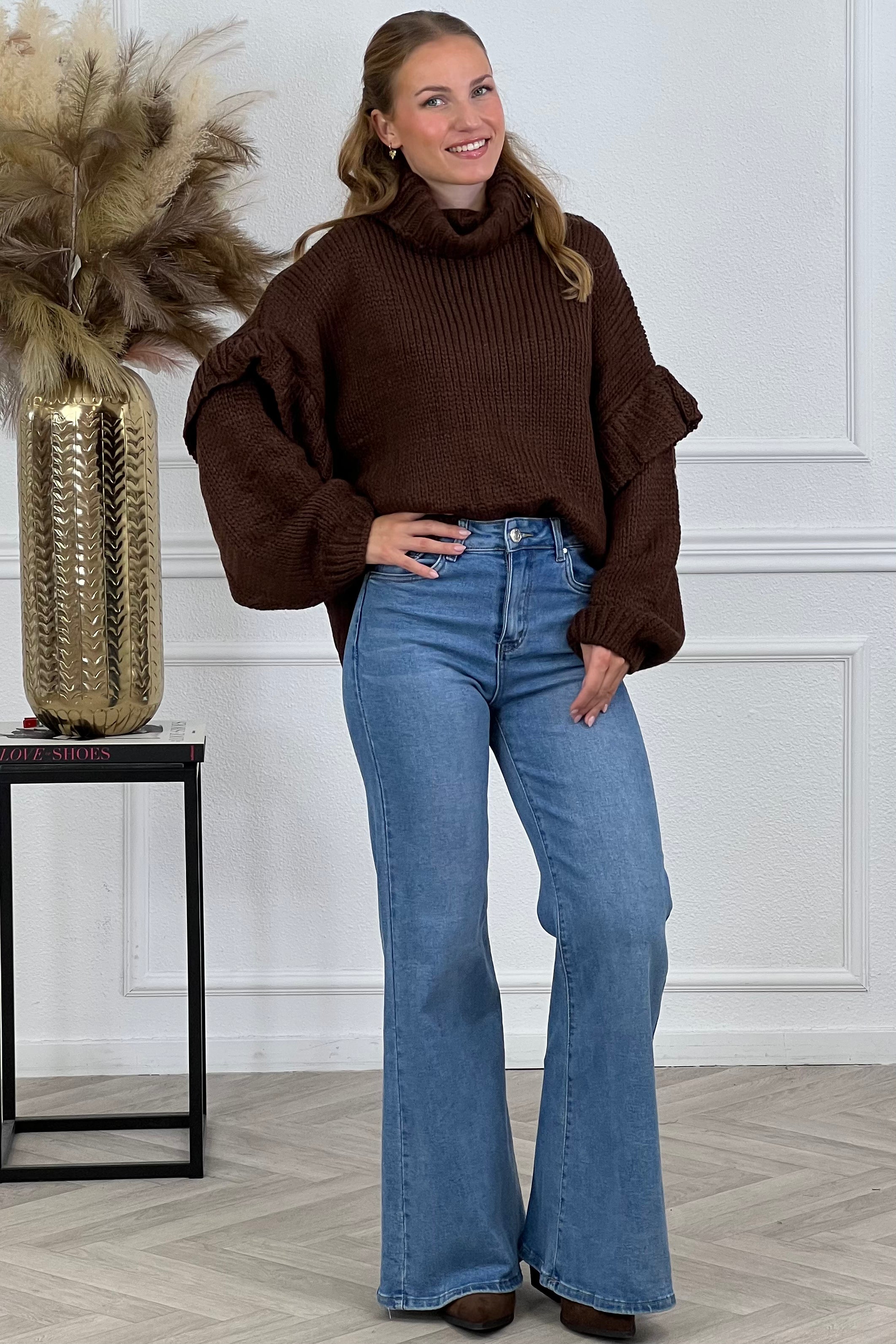 Een heerlijk warme trui met hoge kraag en ruffels aan de mauwen is geschikt voor de komende seizoenen! Te shoppen in meerdere kleuren!