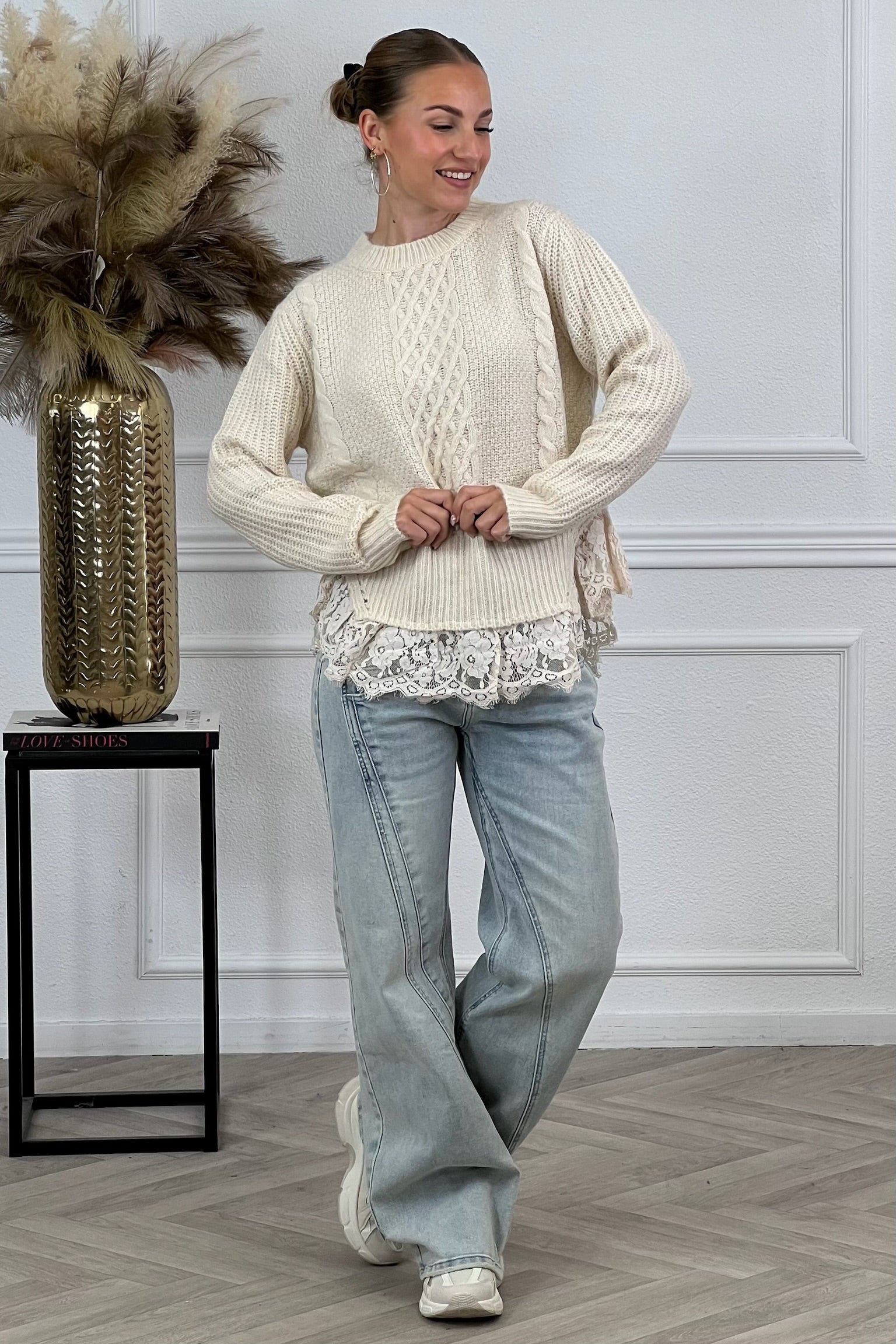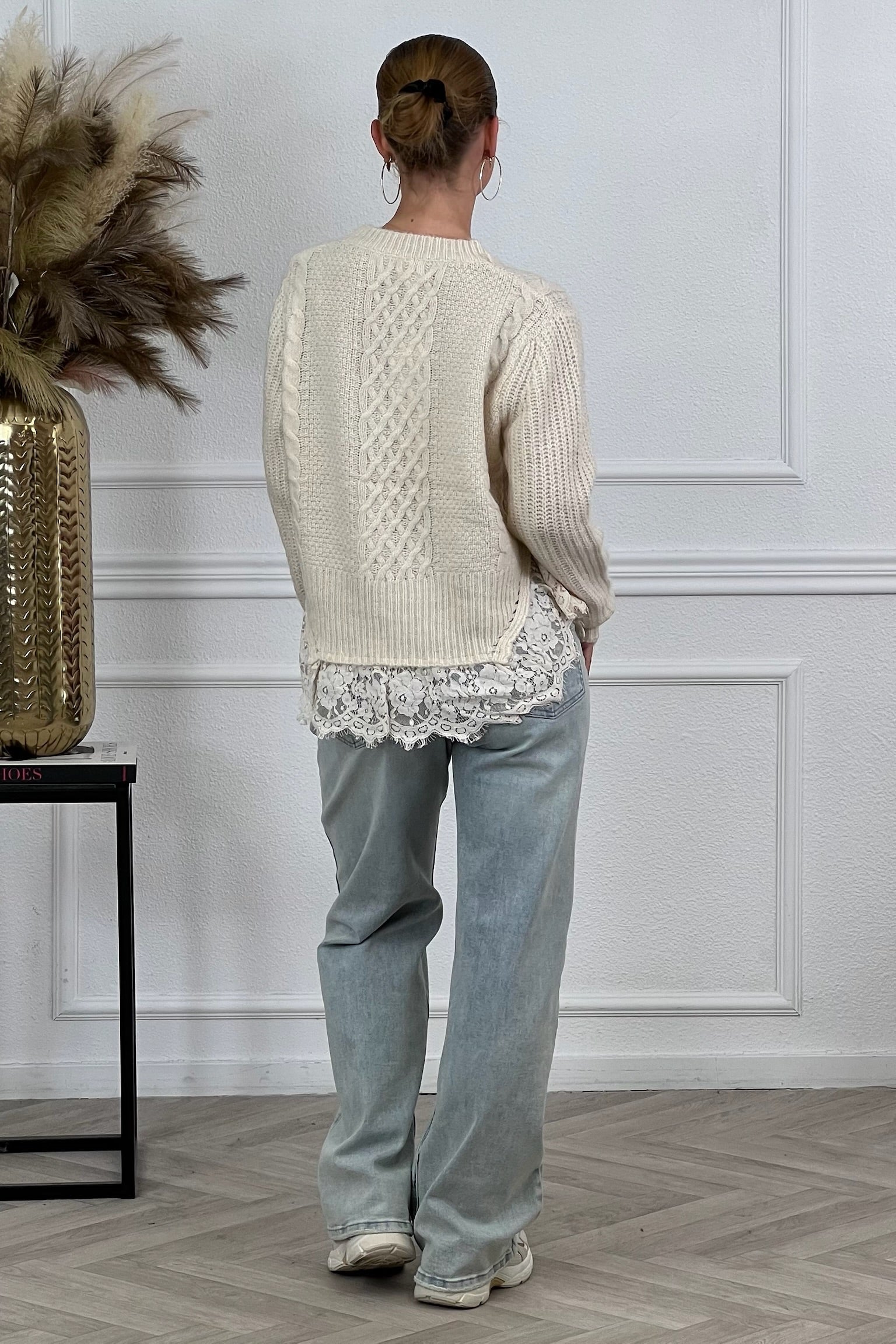Wat een superleuke trui met een mooie onderkant van kant en beschikbaar in meerdere kleuren! Shop hem nu snel in beige!