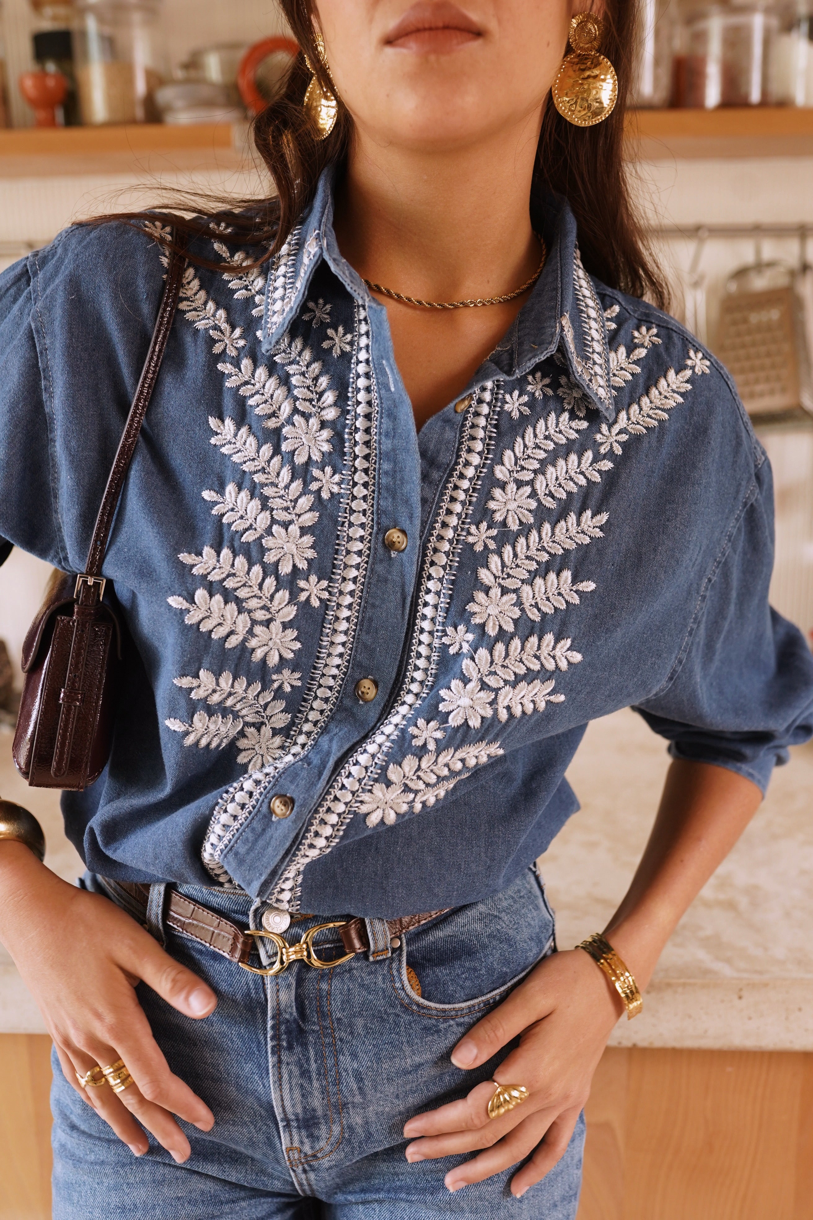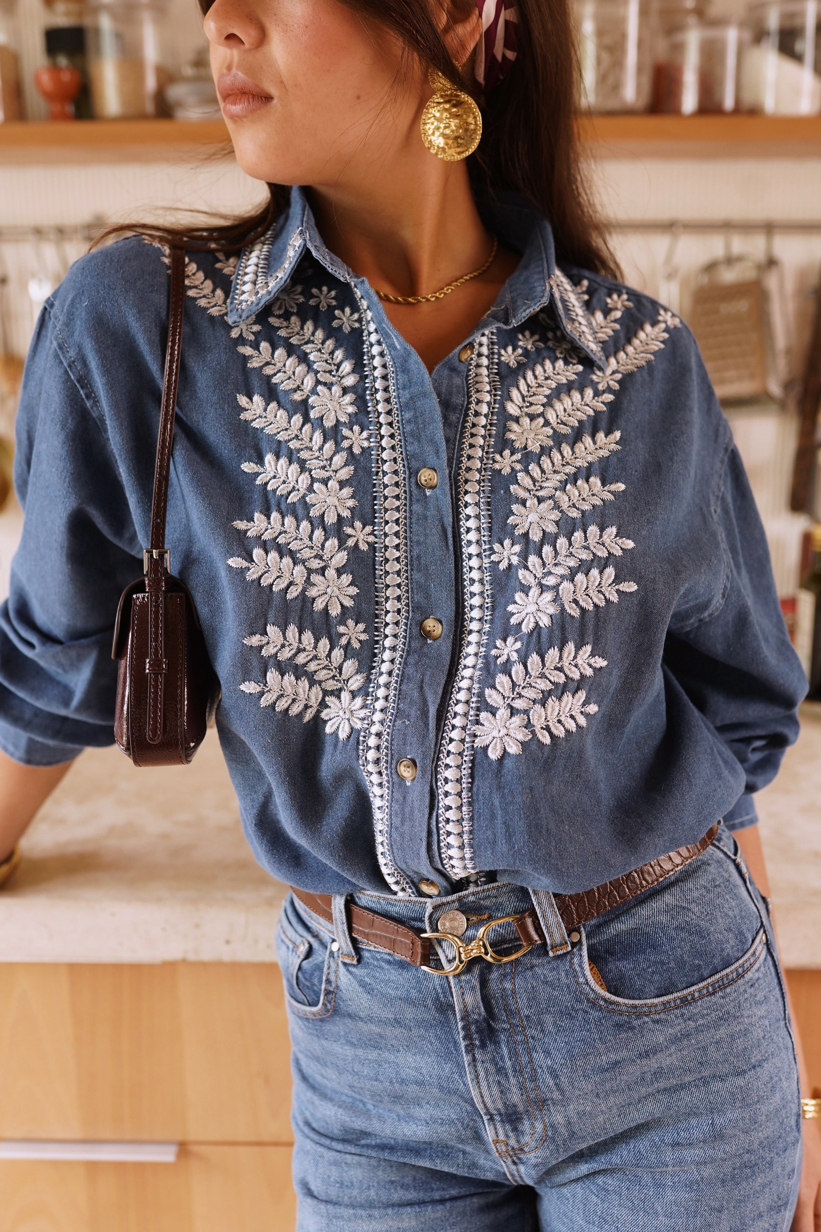 We hebben weer een prachtige nieuwe denim blouse in de collectie, we love it! Met een geborduurde leaves print .Shop hem nu in blue.