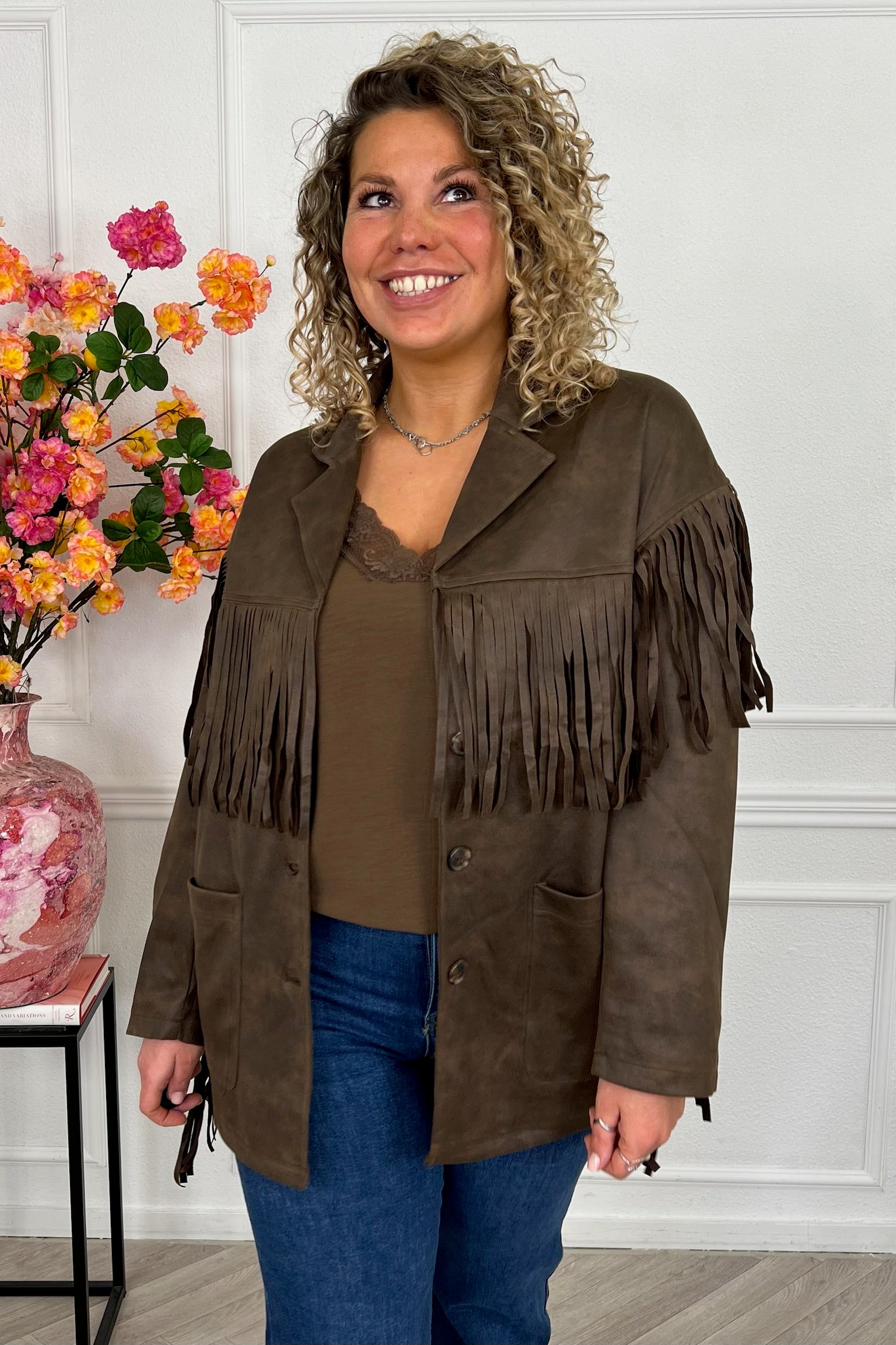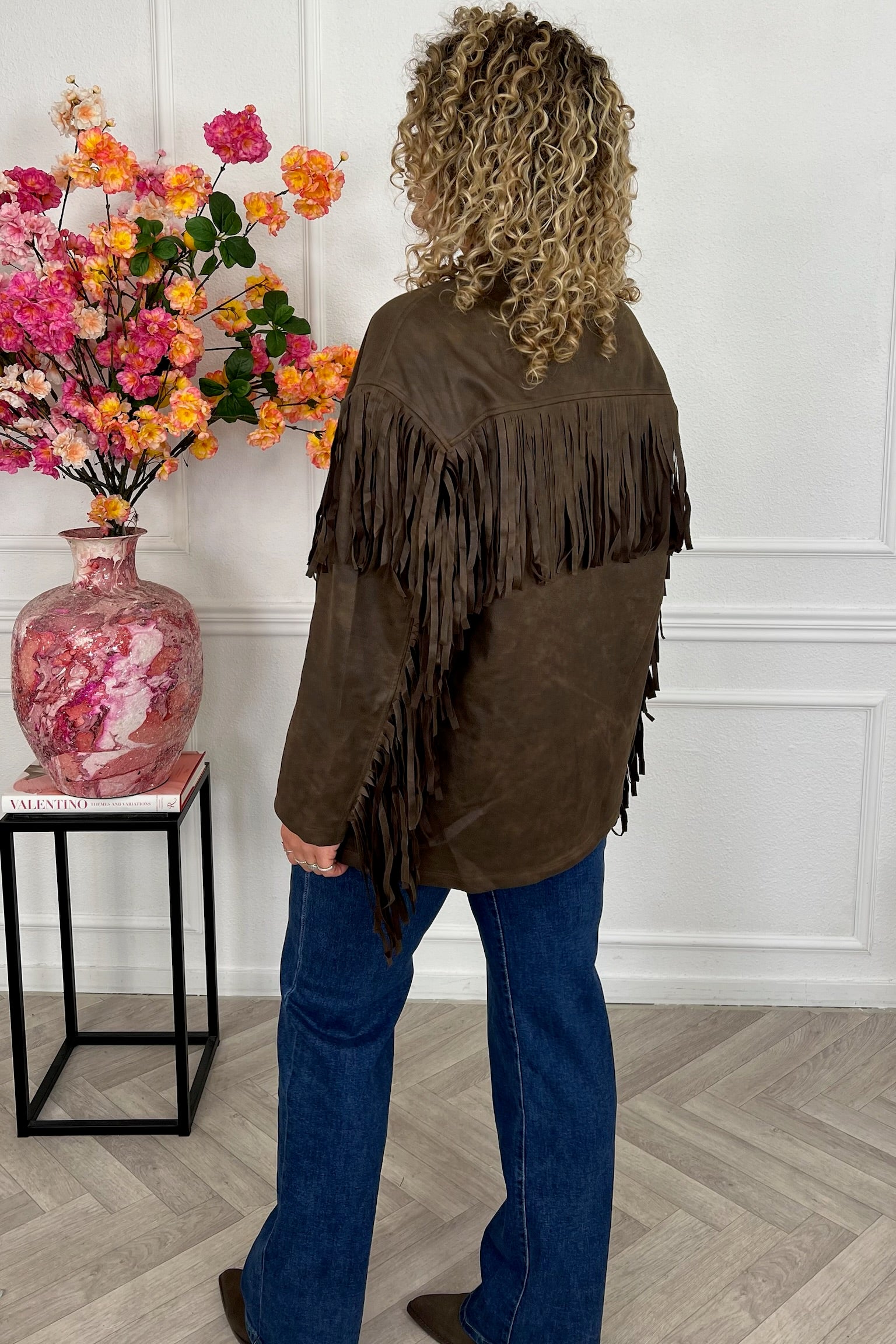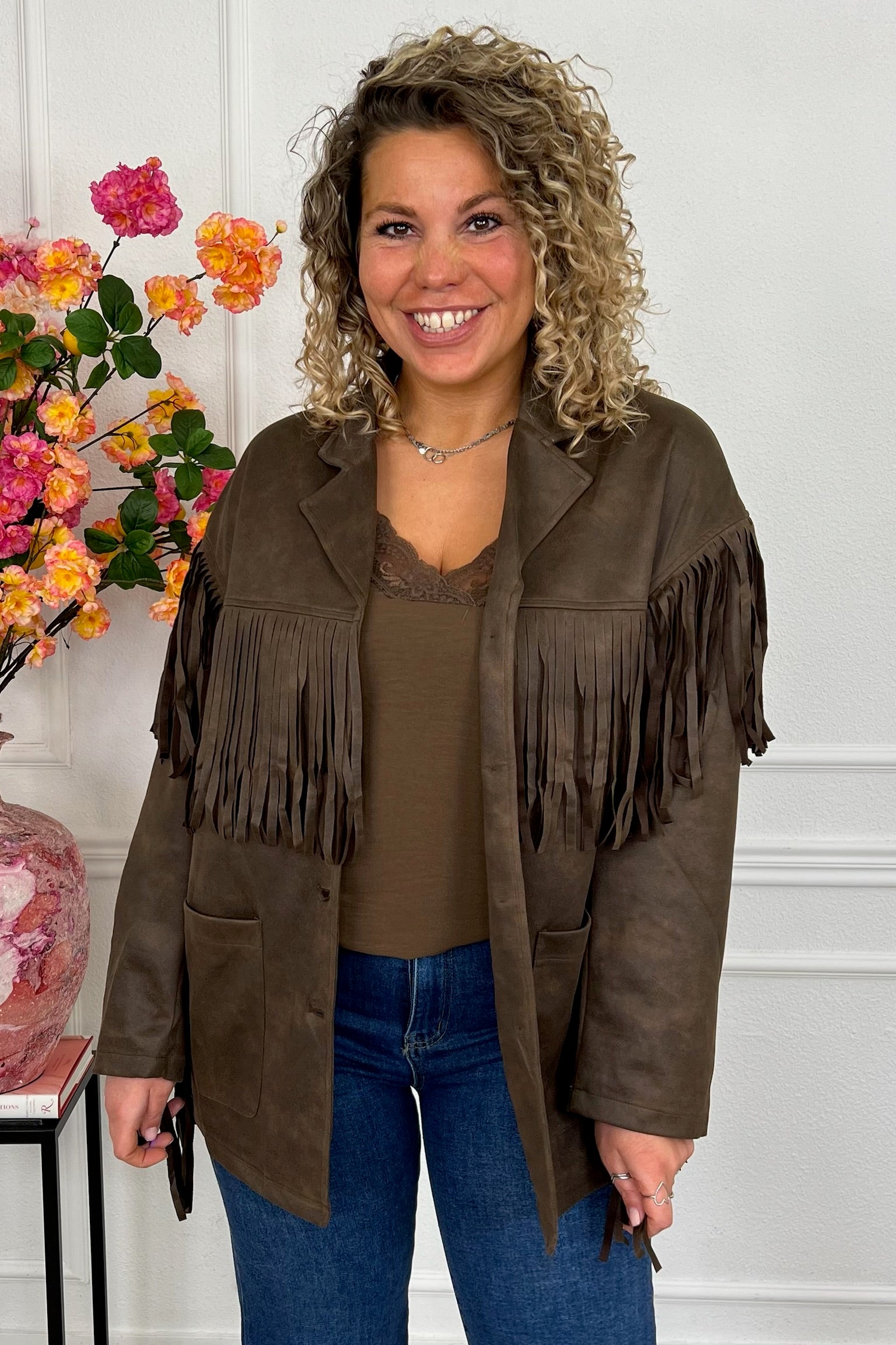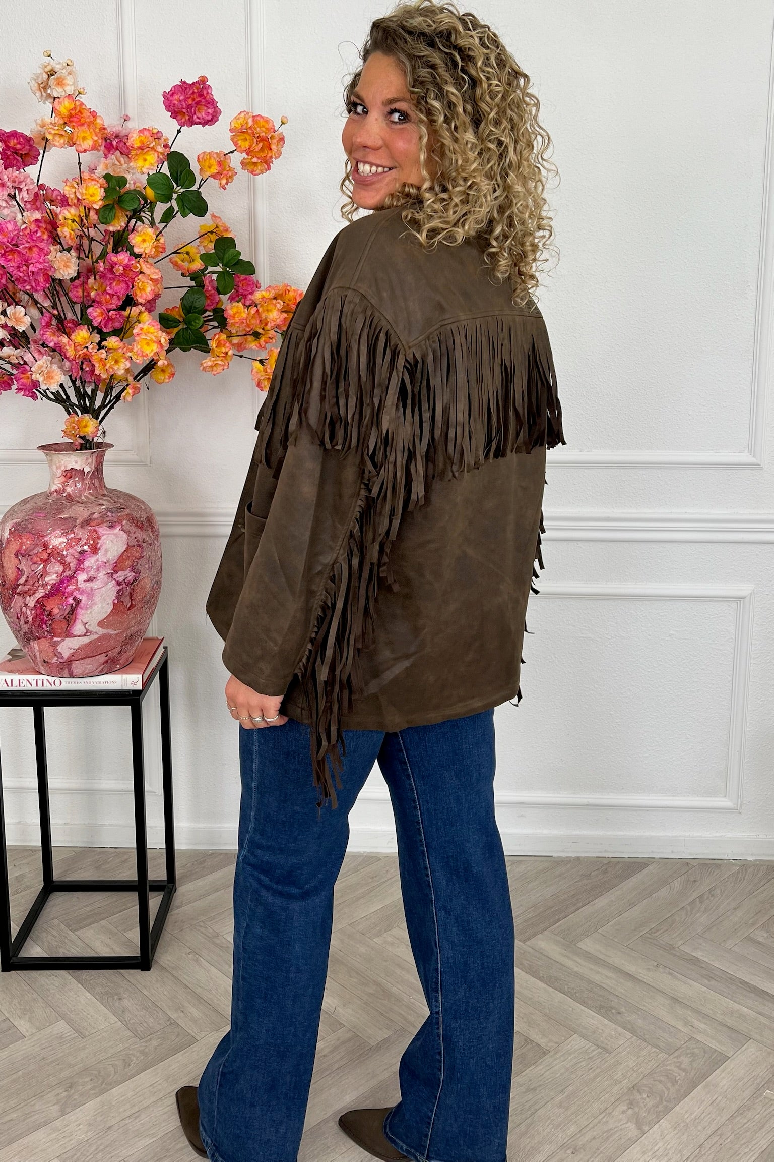 Dit leuke jasje is perfect! Het jasje heeft twee zakken en prachtige franjes. Shop hem in Brown!