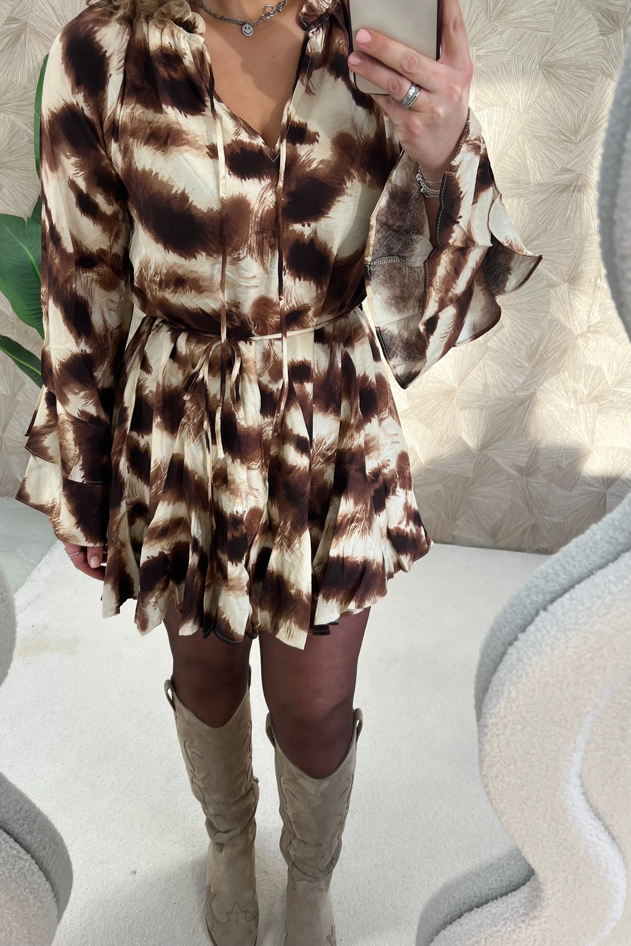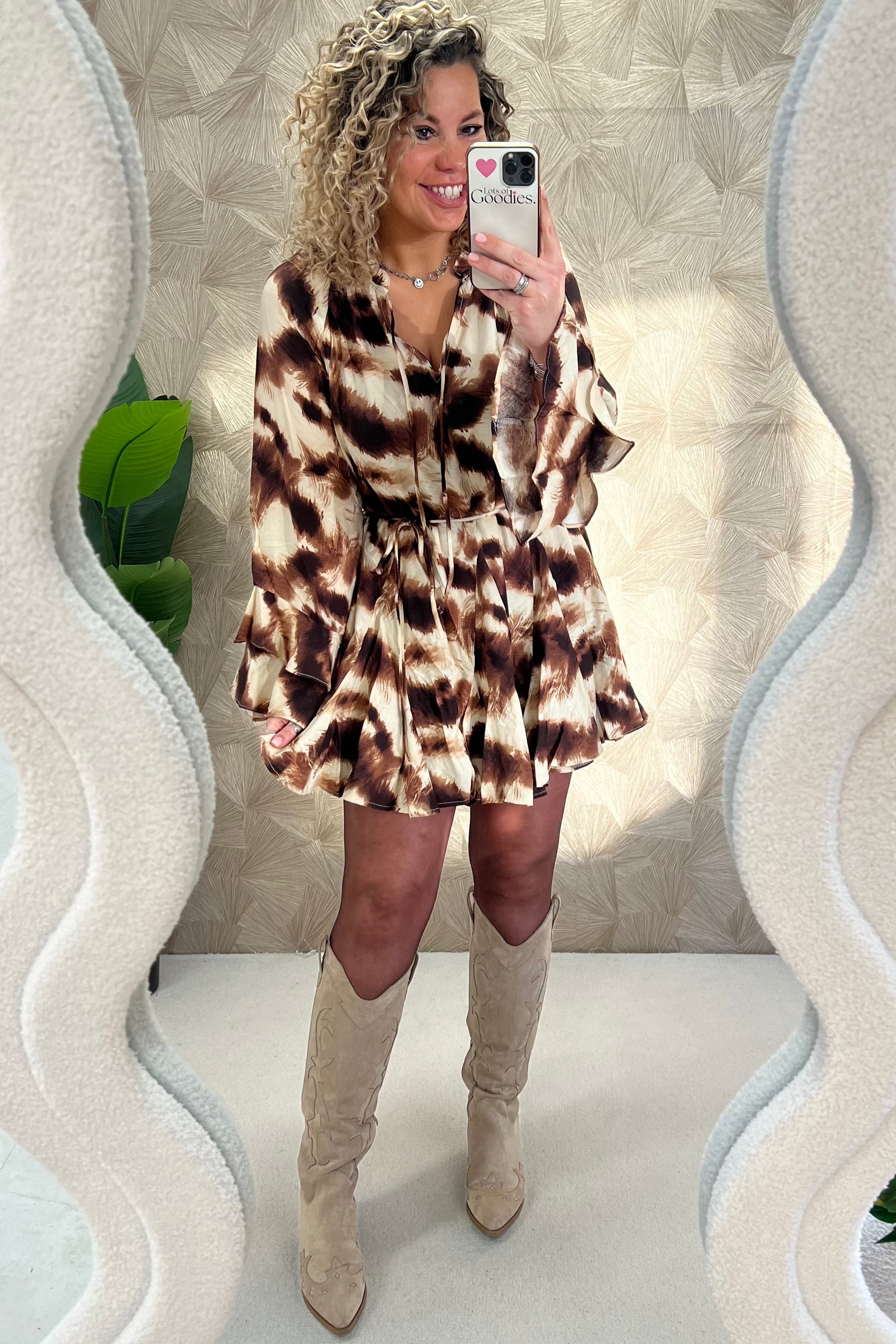 Deze superleuke jurk met prachtige mouwen is nu beschikbaar in meerdere kleuren, we love it! Shop hem nu in brown/beige!
