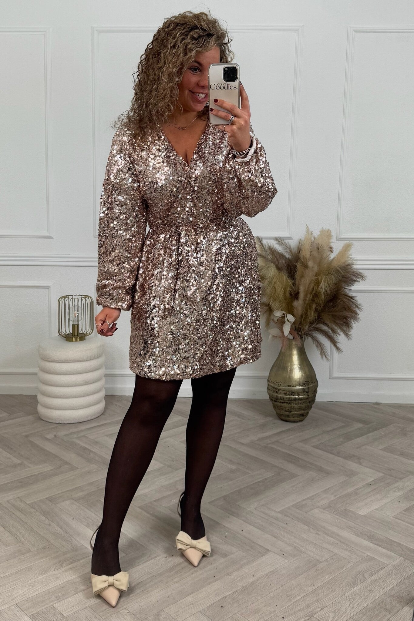 Deze heerlijke party dress shop je nu nieuw online! Wat een deal! Versierd met prachtige pailletten, en heerlijk gevoerd. Shop hem in champagne!