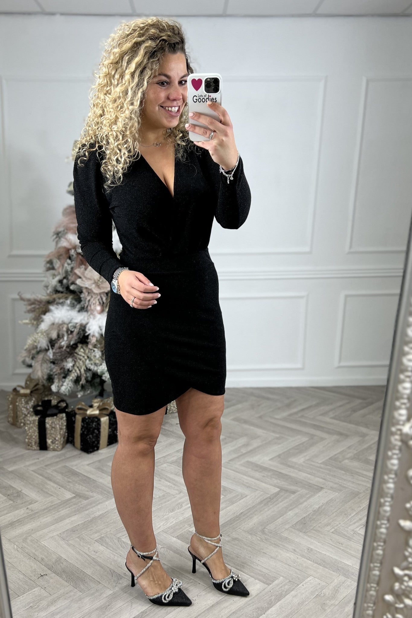 Een prachtige glitter jurk met puffy shoulder details, een overslag in de rok en een strakke taille die je middel mooi accentueert!
