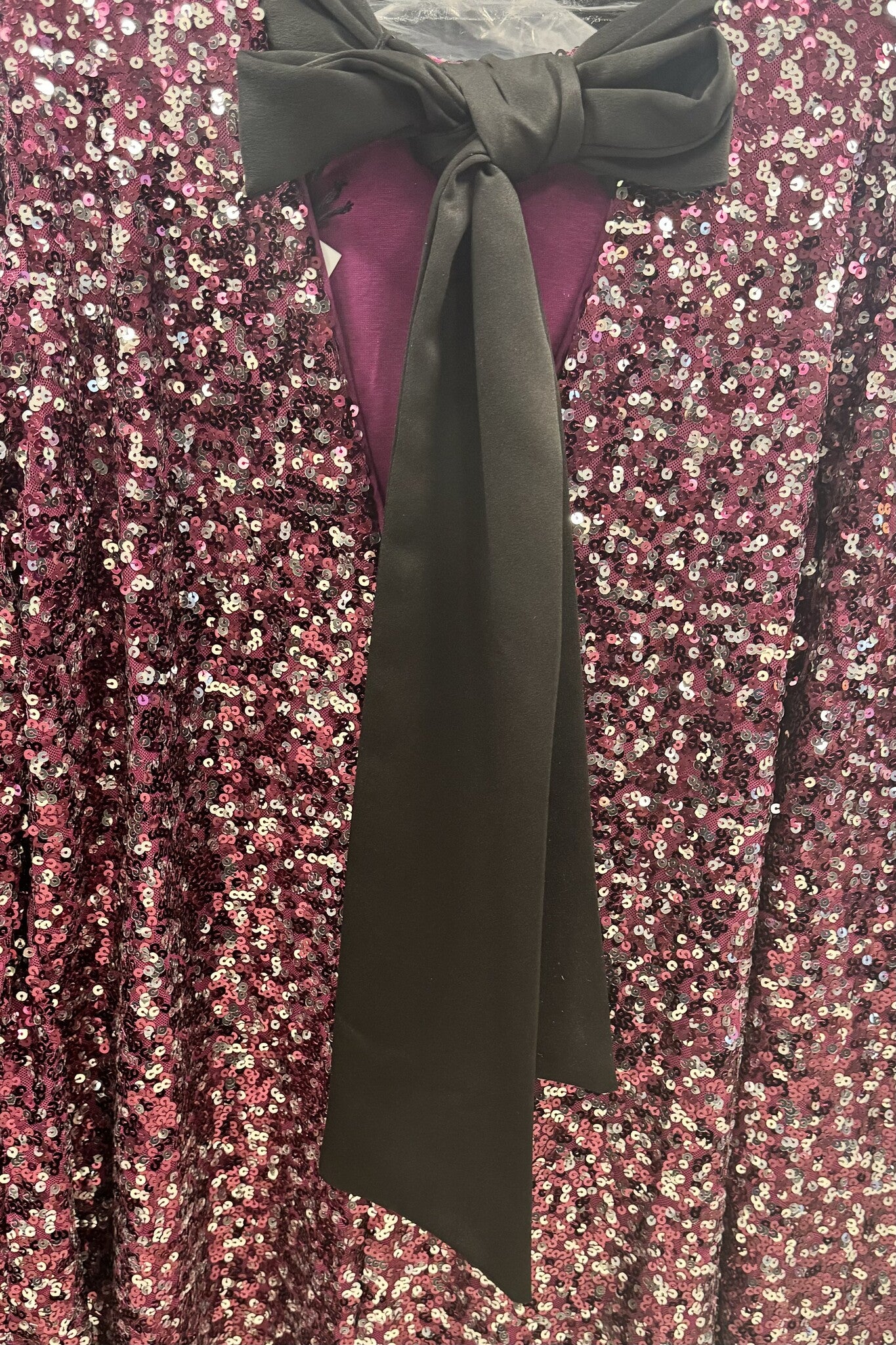Dit prachtige jurkje met pailletten heeft prachtige open rug met grote zwarte bow tie! Met deze jurk steel je de show bij ieder feestje. Je shopt hem in het purple/silver!