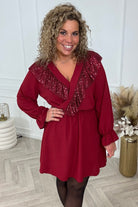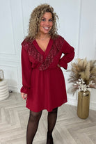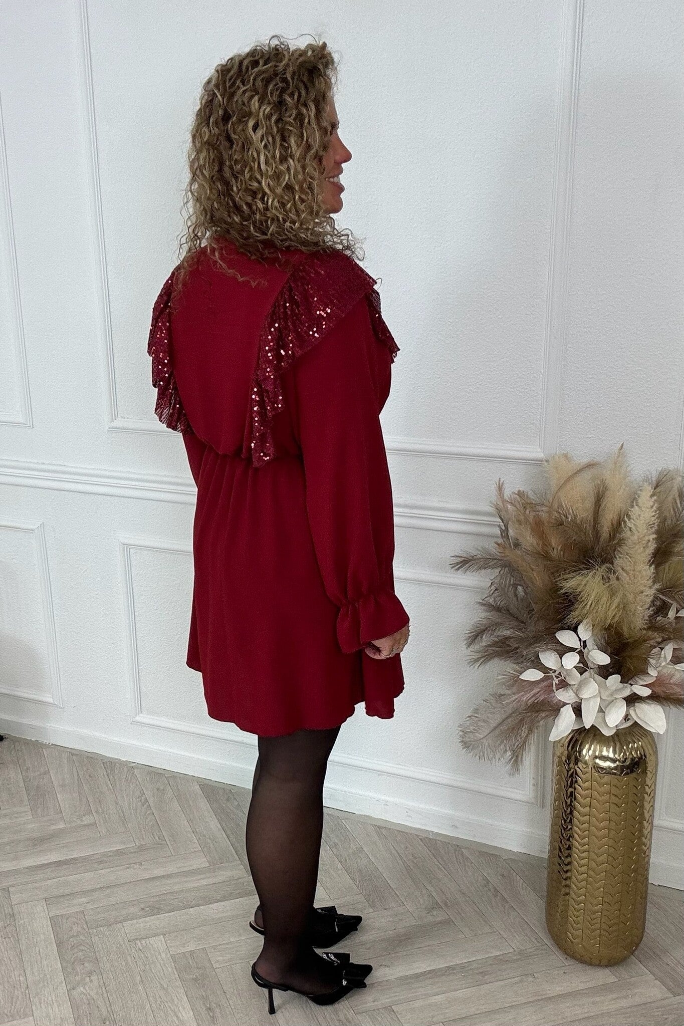Deze fijne ruffle dress is ideaal voor de feestdagen! Hij valt prachtig en heeft mooie sequin details over de borst! Shop hem helemaal in bordeaux!