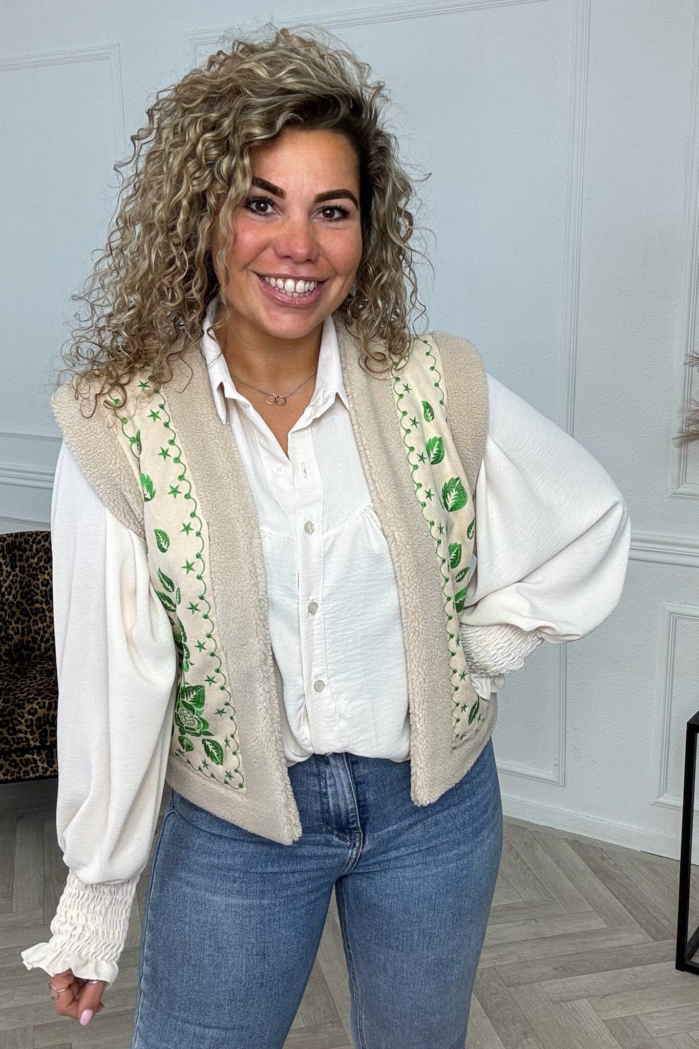 Shop dit prachtige gilet en style je outfit helemaal af! Helemaal on trend! Shop hem in beige met green leaves print!