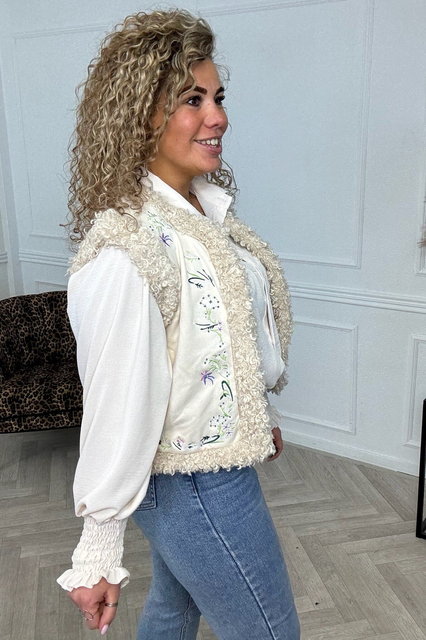 Shop dit prachtige gilet en style je outfit helemaal af! Helemaal on trend! Shop hem in beige met weelderige print!